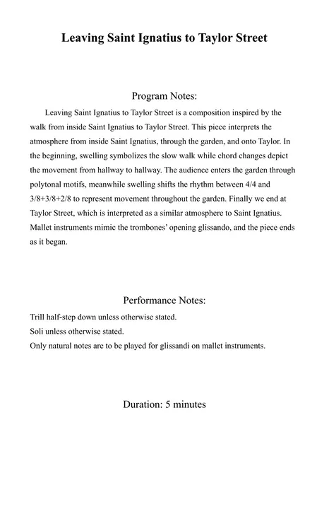 atmosphere from inside Saint Ignatius, through the garden, and onto Taylor. In the beginning, swelling symbolizes the slow walk while chord changes depict the movement from hallway to hallway. The audience enters the garden through polytonal motifs, meanwhile swelling shifts the rhythm between 4/4 and 3/8+3/8+2/8 to represent movement throughout the garden. Finally we end at Taylor Street, which is interpreted as a similar atmosphere to Saint Ignatius. Mallet instruments mimic the trombones’ opening glissando, and the piece ends as it began.