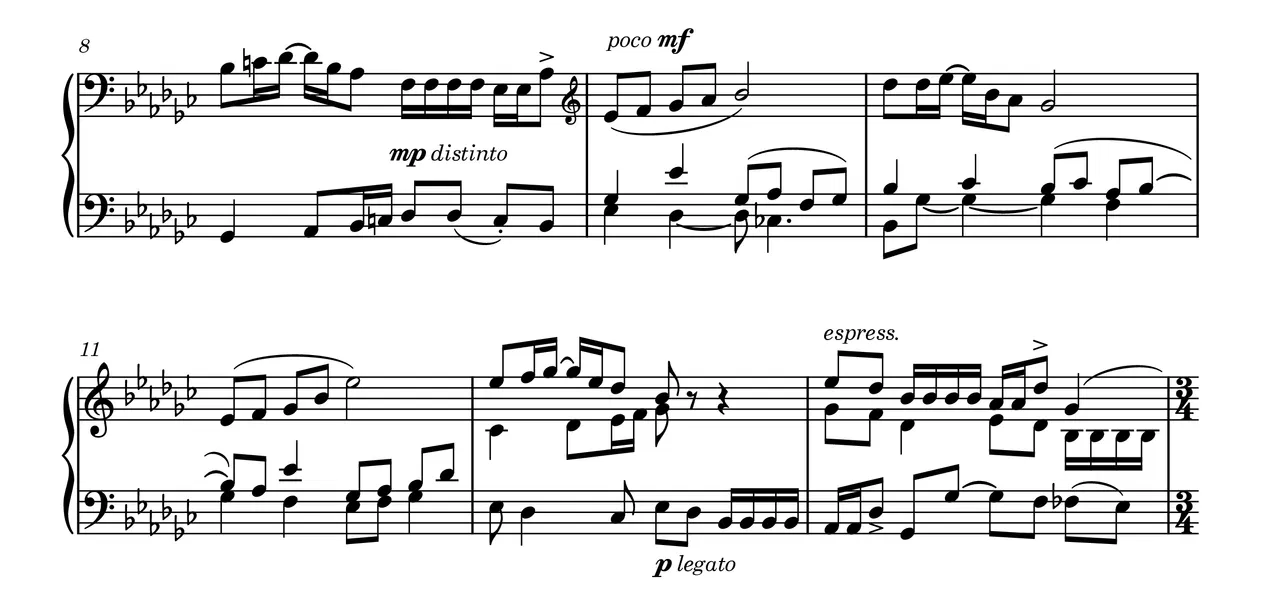 The key of E-flat minor and the almost pentatonic construction of the Subject mean that most of its notes are played on the black keys of the piano. After an exposition of the Subject with diminution (2x), near the end of the first Fugue a quote from the “Sonata in a Movement Op.4 No.2” by the potosino composer and philosopher Marvin Sandi resonates, almost invoking. It is the only Fugue of the cycle where the first subject is presented in the bass, that is, from the depths of the earth, the mines, the mountain...