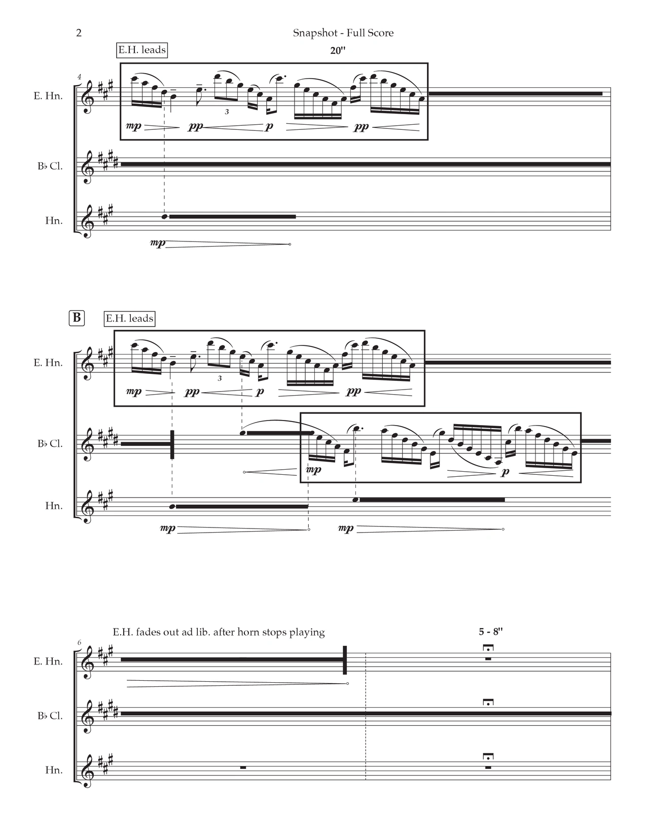 Snapshot is inspired by the Intermezzo in B minor from Brahms’ Op. 119: 4 Klavierstücke. Moved by the endless string of thirds in the delicate opening of the work, I was drawn to seek out multiple interpretations to explore the possibilities in phrasing it. I then extracted the different versions and layered them before electronically manipulating them through time stretching, delays, and filtering. The end result was a meditative ocean of thirds that undulated and sang by chance harmonies due to shifting layers. Snapshot is a translation of this piece into the acoustic world, taking advantage of the instruments in the wind quintet to portray the samples.