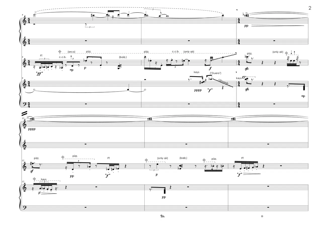 The title of Schattenmusik (Shadow Music), written for the Thin Edge New Music Collective from Toronto, does not indicate a direct transfer of visual laws to the musical medium, but should be understood as a metaphorical expression that can help find a way into the music through recourse to related experiences. Just as shadows point indirectly to something, the piece focuses on different types of sounds that inevitably accompany a conventional, “light-bathed” sound world, but often go unnoticed in its context: noisy sonic artefacts, darker shades of colour or minute micro-harmonic variations. Just as a photo negative contains the real image as its opposite, so too the gestures of the piece are intended to resemble an imprint of a traditional dramaturgy. Towards the end of the work, an unexpected way out of an extended passage of low, meandering streams of sounds that opens up because the most insistent of the three instruments – the violin – asserts itself and induces the others to join it in invoking a pitch centre, played with varying intensity.