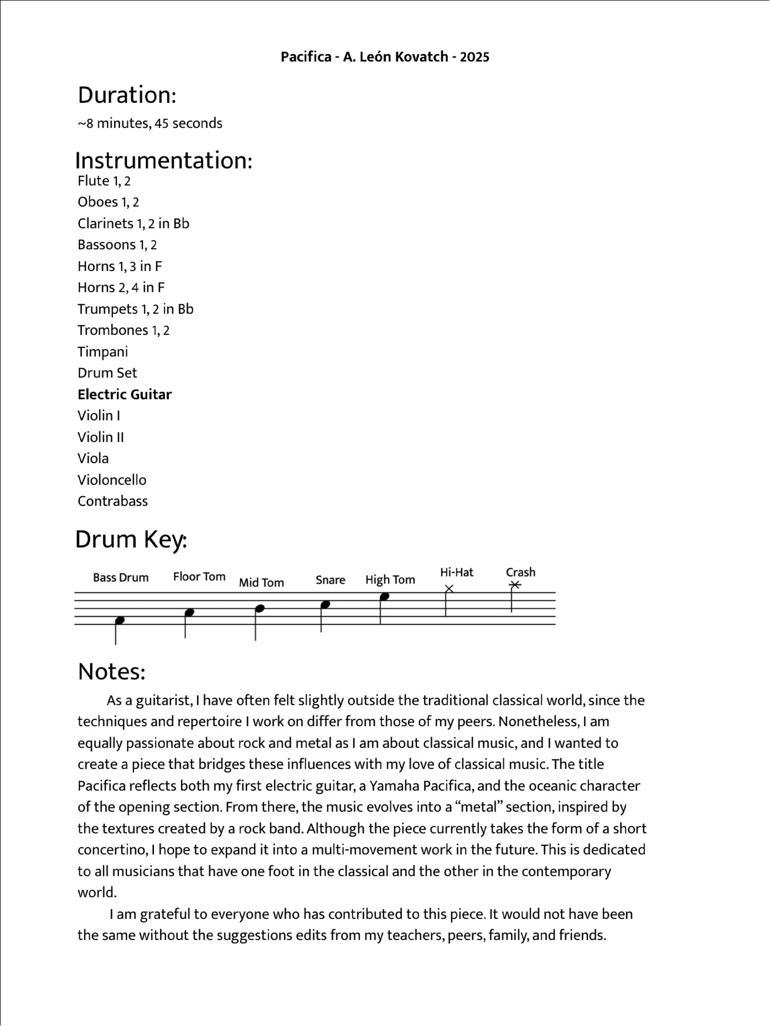 As a guitarist, I have often felt slightly outside the traditional classical world, since the techniques and repertoire I work on differ from those of my peers. Nonetheless, I am equally passionate about rock and metal as I am about classical music, and I wanted to create a piece that bridges these influences with my love of classical music. The title Pacifica reflects both my first electric guitar, a Yamaha Pacifica, and the oceanic character of the opening section. From there, the music evolves into a “metal” section, inspired by the textures created by a rock band. Although the piece currently takes the form of a short concertino, I hope to expand it into a multi-movement work in the future. This is dedicated to all musicians that have one foot in the classical and the other in the contemporary world.