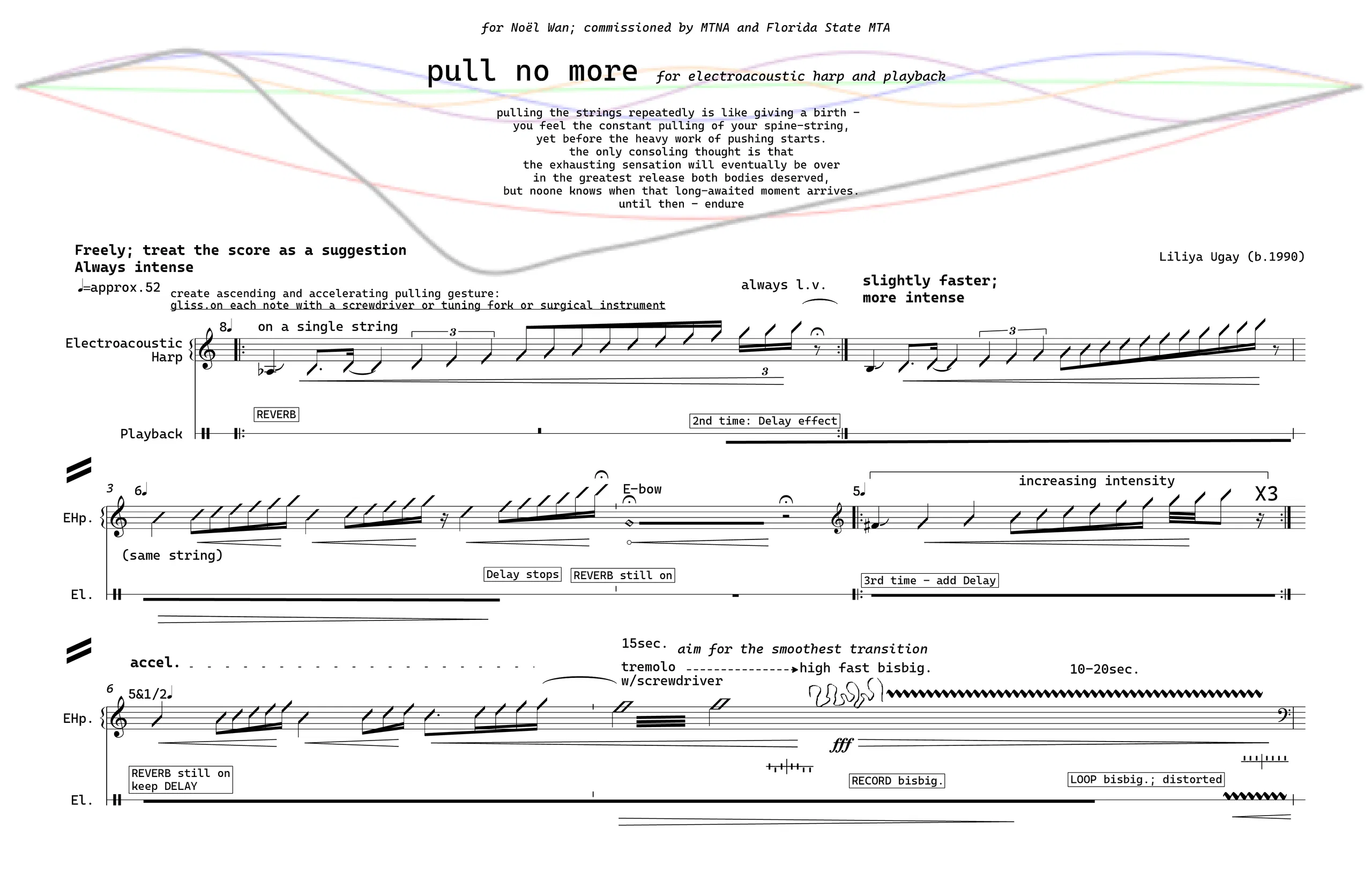 In the Western society a harp, or playing harp, is associated with a feminine image or activity of a very limited type: a “pretty” woman playing pleasant music, often connected to divinity, due to the history of its visual representation.  In contrast, for this piece I aimed to connect the harp to true, raw femininity, as for me it replicates an action only female human body is capable of: a childbirth. Harp is an extremely intense instrument physically because for each note the string must be pulled by hand/finger flesh. I associate this intense action with the sense of pulling during the labor contractions, based on which I wrote the following poem: