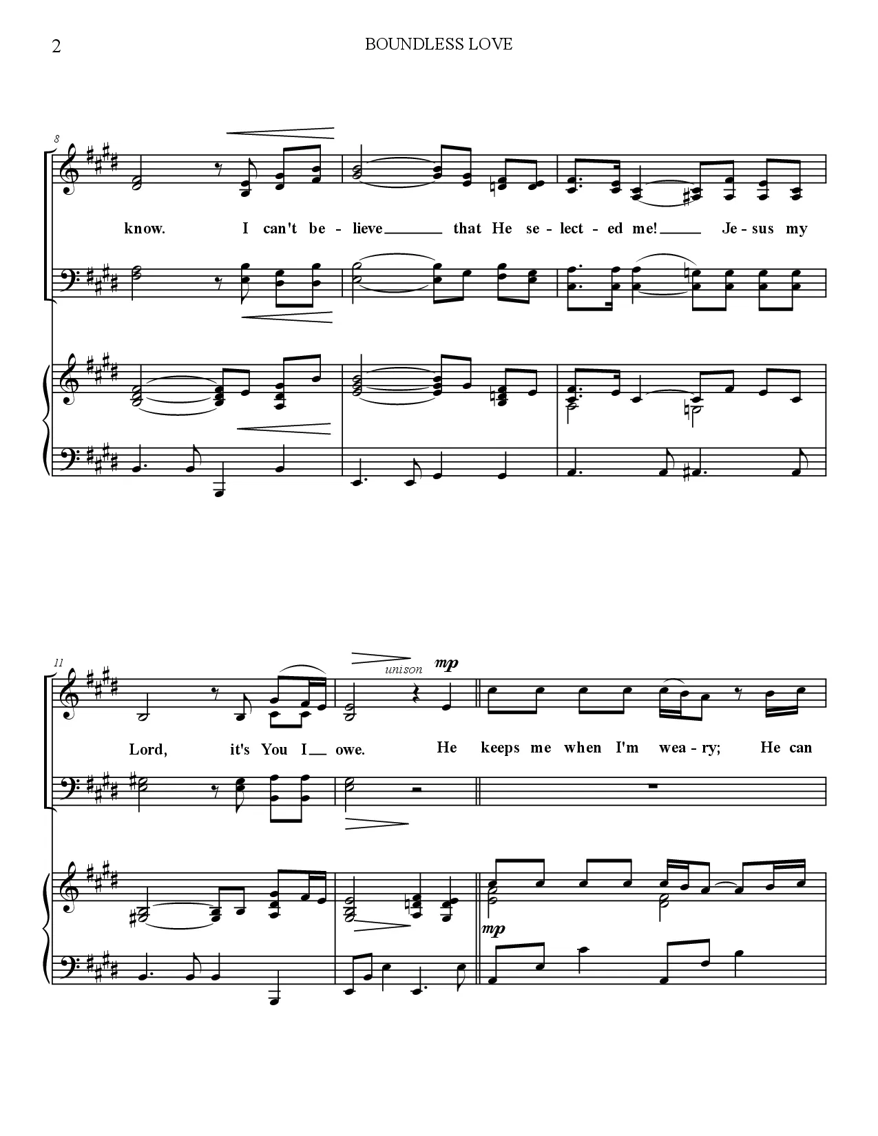 An SATB arrangement of the beloved gospel song "Boundless Love". Keeping the gentle feel, this moderate / easy arrangement is accessible for a quartet to a large choir. The lyrics lend it to a general worship theme.