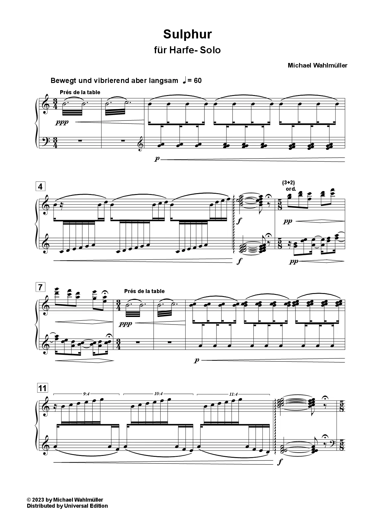 The piece "Sulphur" was written in 2022 during the summer. and is designed for harp solo. It was premiered in Vienna in 2023 and is a tone-painting representation of sulphur.