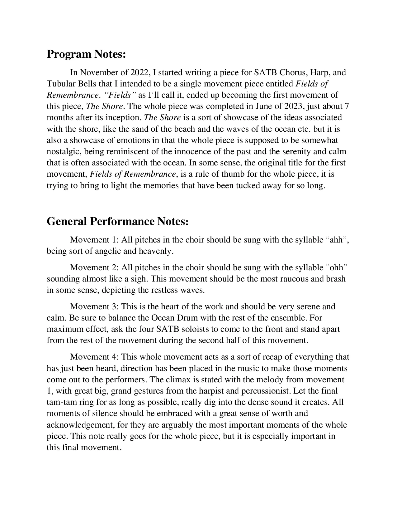In November of 2022, I started writing a piece for SATB Chorus, Harp, and Tubular Bells that I intended to be a single movement piece entitled Fields of Remembrance. “Fields” as I’ll call it, ended up becoming the first movement of this piece, The Shore. The whole piece was completed in June of 2023, just about 7 months after its inception. The Shore is a sort of showcase of the ideas associated with the shore, like the sand of the beach and the waves of the ocean etc. but it is also a showcase of emotions in that the whole piece is supposed to be somewhat nostalgic, being reminiscent of the innocence of the past and the serenity and calm that is often associated with the ocean. In some sense, the original title for the first movement, Fields of Remembrance, is a rule of thumb for the whole piece, it is trying to bring to light the memories that have been tucked away for so long.