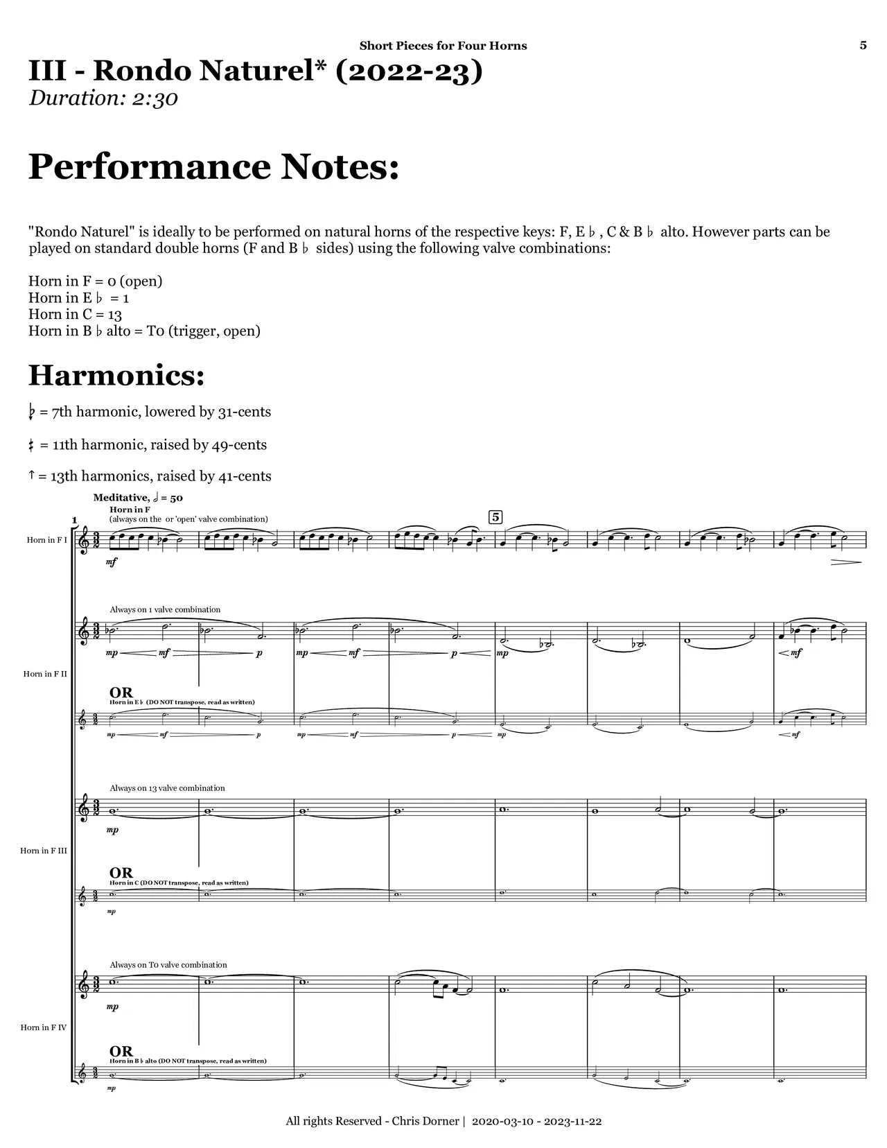 Piece III: "Rondo Naturel" (Natural Rondo) alludes to the piece's structure and the type of horns the piece should be performed on (or mimicking the types of horns). The horn’s range is large, and it sits perfectly within the harmonic series allowing players access to a multitude of harmonics. Taking advantage of this, I decided to focus an entire piece on the horn’s capabilities within the harmonic series. Each horn is assigned a key/fundamental (either to be played on a natural horn of the respective key or using the valve combination to mimic the natural horn of said key) and confined to the harmonic series of that fundamental—hence “Naturel” within the title, in reference to both the types of horns used, as well as the fact that the harmonic series is naturally occurring. Using the harmonic series, an A-material is formed and always contrasted by opposing material, with all the materials gradually becoming more varied with each repetition—the quintessential rondo form.