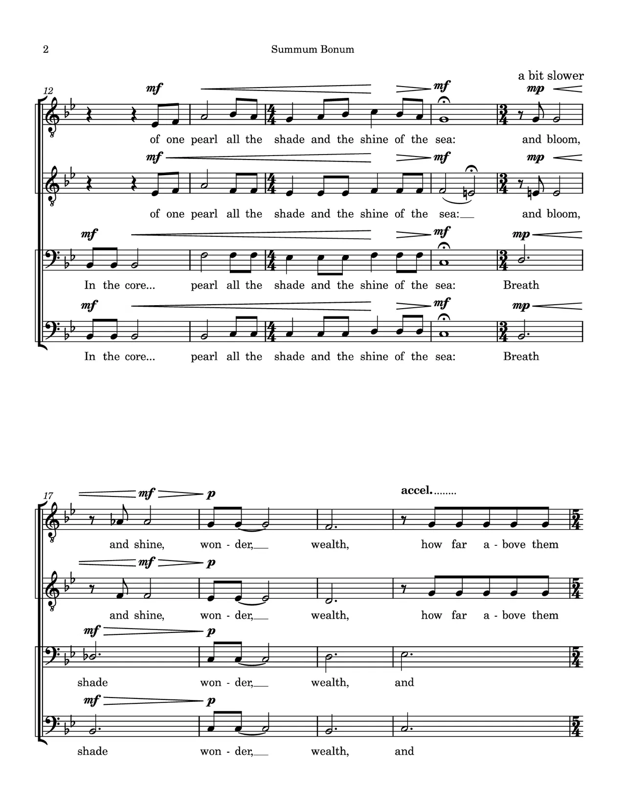 It is a rather short piece that should not be harmonically difficult to sing. The tempo should not be strict throughout. Ensembles are free to find their own ebb and flow within each phrase using the tempo markings as a point of reference to stay around. This, I feel, lends more weight to the text while causing the piece to become more intimate for the performers and, thus, the audience.