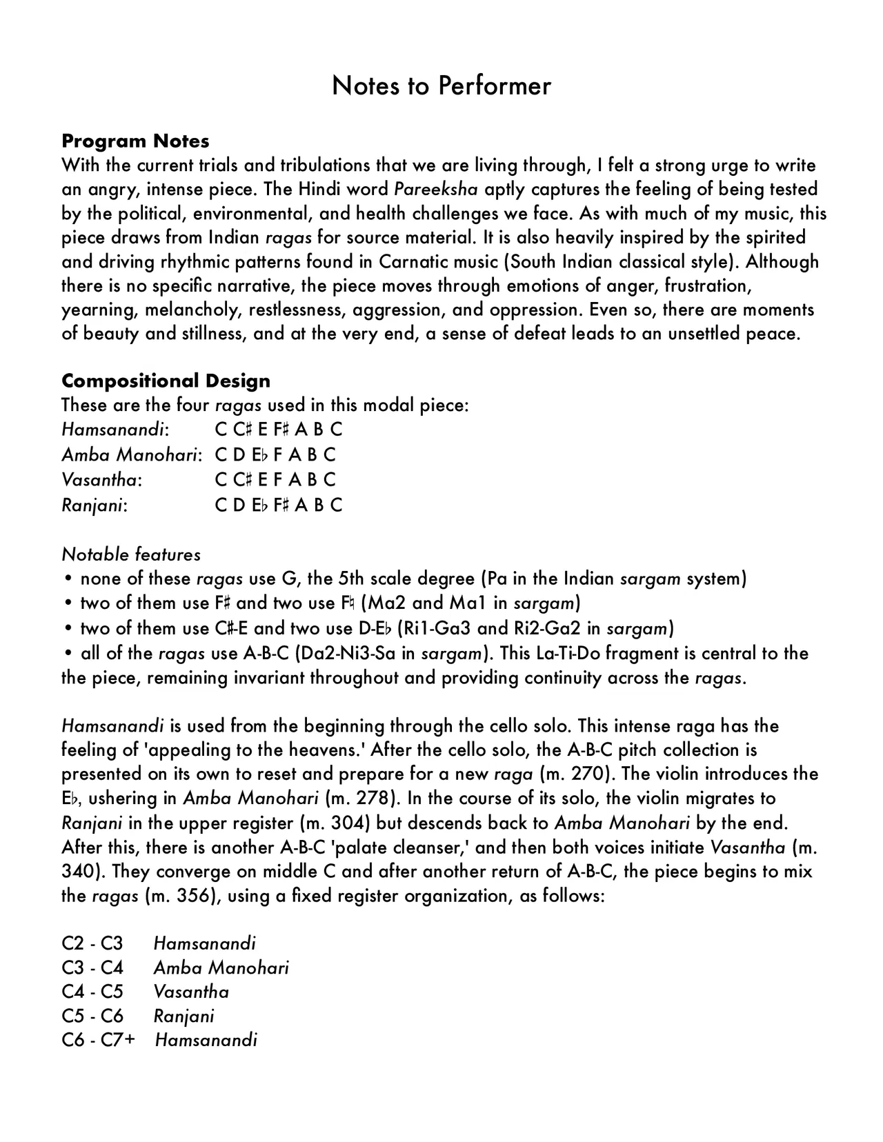 With the current trials and tribulations that we are living through, I felt a strong urge to write an angry, intense piece. The Hindi word Pareeksha aptly captures the feeling of being tested by the political, environmental, and health challenges we face. As with much of my music, this piece draws from Indian ragas for source material. It is also heavily inspired by the spirited and driving rhythmic patterns found in Carnatic music (South Indian classical style). Although there is no specific narrative, the piece moves through emotions of anger, frustration, yearning, melancholy, restlessness, aggression, and oppression. Even so, there are moments of beauty and stillness, and at the very end, a sense of defeat leads to an unsettled peace. (Score purchase available at www.twocomposers.org/asha/works.php)