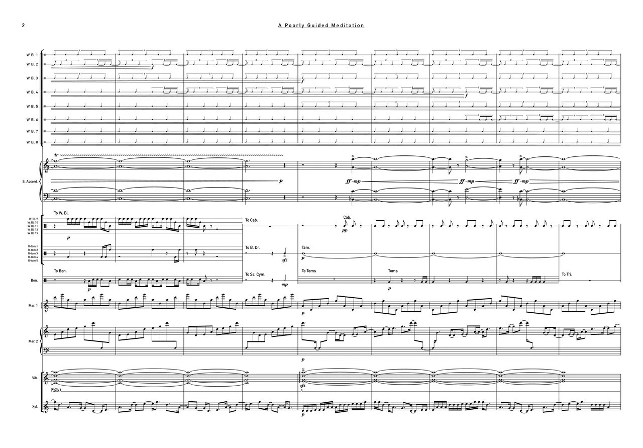 That being said, it was always curious the kinds of imagery that would pop up while in that beginning phase, which would usually present themselves as strange and wacky flights of fantasy. This piece is meant to illustrate that phenomenon, with the 8’ min span of time being divided into strict 40 second intervals (simulating a shorter version of my own meditation timer), embarking on extreme variation of each previous section as the cue arrives.