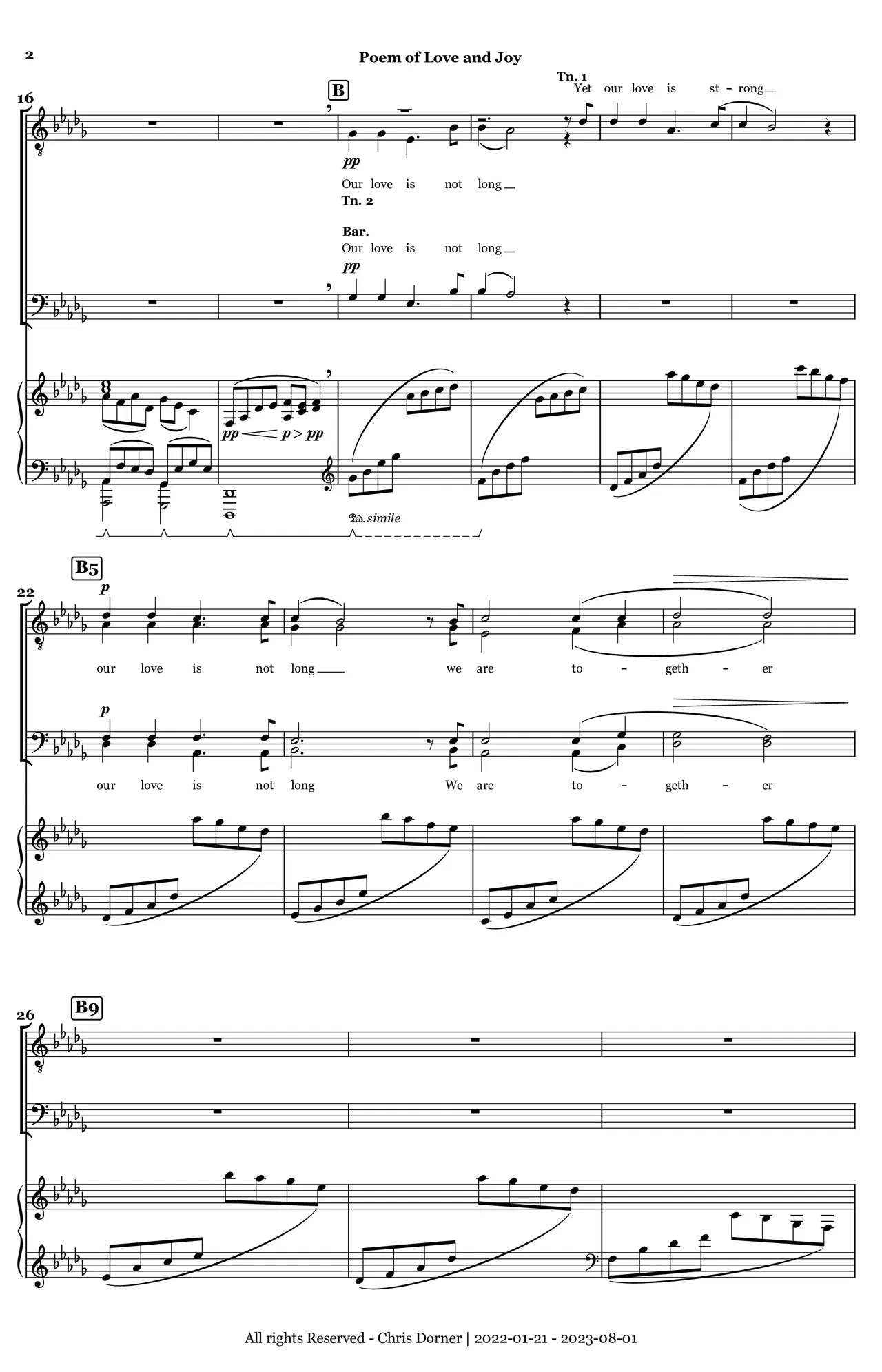 During my final year of high school in 2022, I had the opportunity to perform Z. Randall Stroope’s "Amor de Mi Alma", a stunning piece based on a 16th-century love poem. After some time had passed, I began to reflect on the moment and felt inspired to create a similar piece, infused with my own experiences and influences. Thus, I started writing "Poem of Love and Joy". My primary decision and goal for this piece was to compose a love poem that did not address any individual but instead focus on the issues of love from a gay male perspective. The piece delves into the intricacies of queer love, emphasizing its rarity, beauty, and