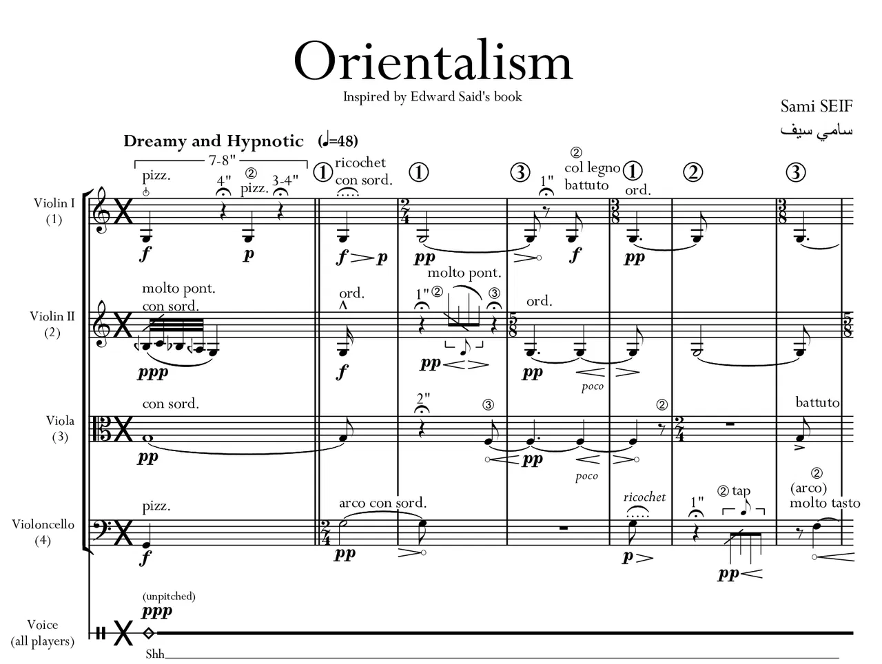 Unlike a traditional string quartet, which seeks to blend the individual player with the quartet, my piece seeks to identify the individual in opposition to the ensemble. Just as time flows smoothly from player to player, so too do sounds bleed into each other like different colors, or different perspectives continually intruding into one another – whilst alternating with solo passages. This draws a parallel with the disconnection between the individual and the system, between my individual sense of self as an Arab in America, or a Christian from a Muslim-majority country (both of which Edward Said himself experienced), and the system and politicized representation of the Middle-East and of its peoples (often viewed as only one people).