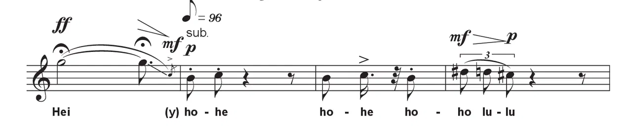 My approach as a composer was first to make my own guesses as to what text-strings come from the same material (bhishma, bahlika, vena etc. made it clear that this is the case), and where the material changes. I treated some words as pivots between sources, whereas other changes are instantaneous. Then worked instinctively, treating each text fragment with full compositional seriousness, only consciously connecting my musical material when I had decided that two texts shared an origin. The shifts between material are frequently as though a radio station has been suddenly switched – although this is a radio that only plays solo vocal music (perhaps with imagined accompaniments).