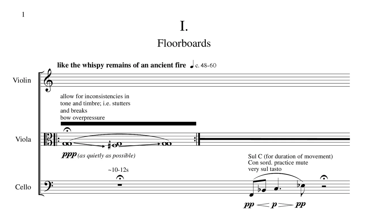 Remains of a Permian Gas Station, which won a BMI Student Composer Award in 2022 and 2023 American Prize, is a string trio inspired by an abandoned gas station in West Texas. Through its eight movements, Remains of a Permian Gas Station explores themes of degradation through its structure while sonically simulating the gas station’s deteriorating interior; promises of musical symmetry are inevitably corroded, recurring musical ideas are twisted before being left for dead, leaving space for strange, organic ideas to spring from the cracks. The piece, like the gas station it takes its inspiration from, urges forward from the exploitative systems that once defined it and finds roots in decay.
