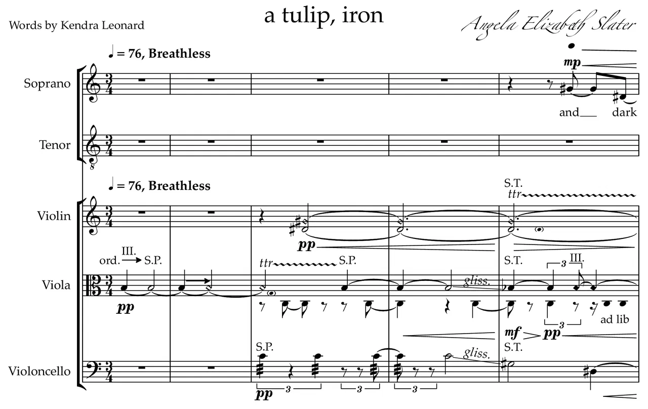 a tulip, iron is about the fear and horror created by psychological and emotional abuse, the relief of escape from abuse, and the work required to contend with traumatic memories of it. Using Perle Fine’s work The Early Morning Garden (1957) as a focusing device for this lyric, I work with elements of the natural world as well as my own personal history. The mezzo soprano and tenor serve as protagonist and antagonist, respectfully, and I’ve made it deliberately unclear as to whether their texts and interactions are taking place in the present or are memories. The text is in three loose sections, through which the protagonist moves from fear and intense self-doubt into greater agency, grapples with the causes and extent of her wounds, recognizes how trauma has shaped her, and becomes able to distance herself from it. The antagonist diminishes and humiliates the protagonist, causing her to hesitate and sing in fragments of sentences. He calls her simple and an embarrassment, disparaging her mind and body and abilities, even as she begins to communicate more fully and lyrically and draws on a wider world for her outlook. Finally, he—or the memory of his words and actions—falls silent, becoming nothing to the protagonist, as she leaves the scene—or memory—with self- determination.