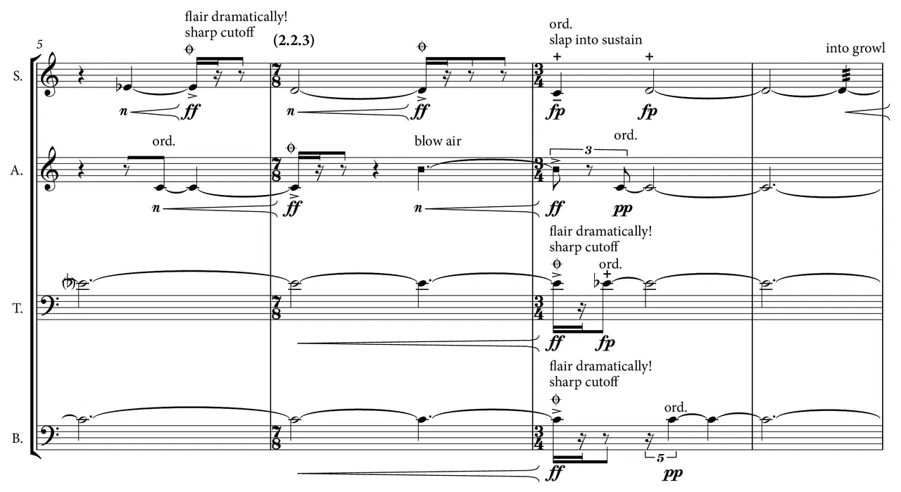 Over the course of the piece, I sought to shift throughout between treating the quartet as a singular entity versus four unique players. The resulting work scatters its lines across the group, assigning disparate notes and rhythms to each musician as they discover the composite together. Players enter and peel off constantly, and even in moments of stasis, there is an element of confusion - it’s not always clear which instrument is playing which sounds. Even with all its raucous sounds and lurching instability, though, To Speak As One is intended to be an intimate piece, ultimately focusing on how a small ensemble - with all their cuing, breathing, and eye contact - can discover ways to nonverbally find shared understanding with one another.