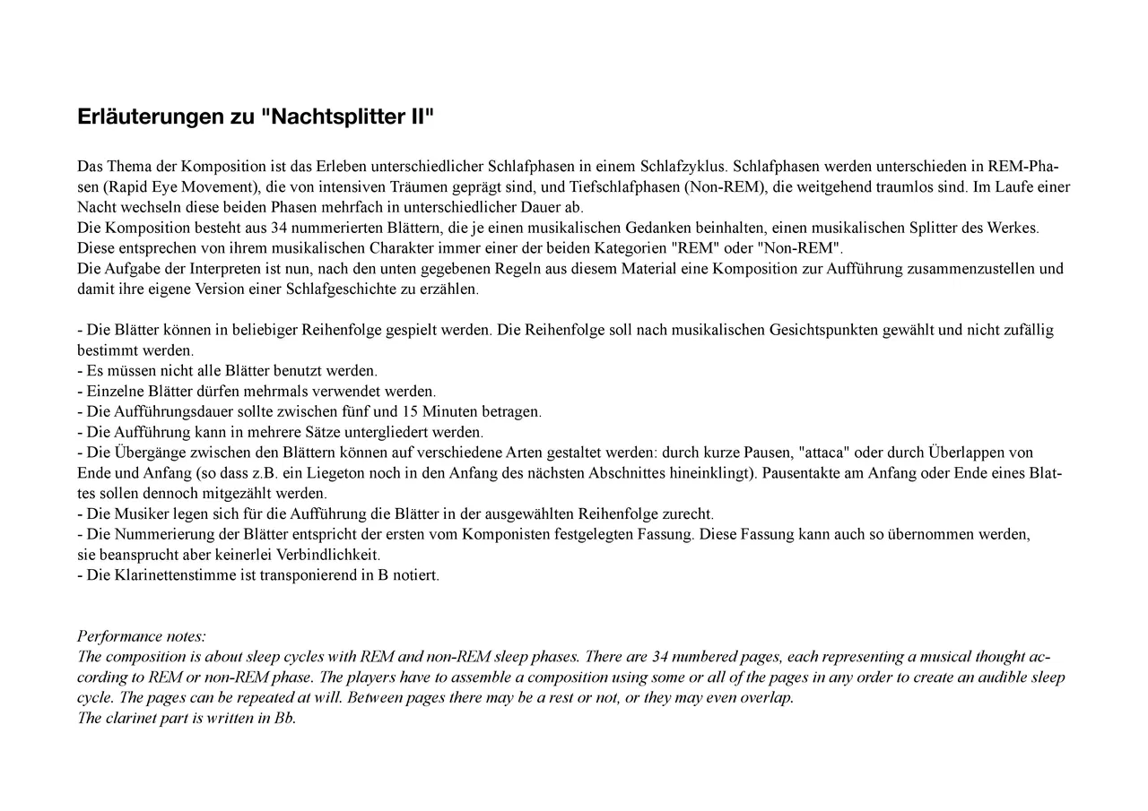 Nachtsplitter deals with the concept of REM and non-REM sleep, the differentiation between dreaming and not dreaming while sleeping. During a normal night both phases alternate multiple times, varying in length. In a similar manner, sections of energetic outbursts and section of calm pondering are placed side by side in this music, giving it a kind of fractured, uncompleted impression. While Nachtsplitter from 2009 is a linear composition, Nachtsplitter II for clarinet and piano breaks the composition into multiple small sections, each on a single sheet of paper, which can be played in any ordner, repeated or omitted. It is the performers task to create a working sequence and realize their own dreaming experience in playing the piece.