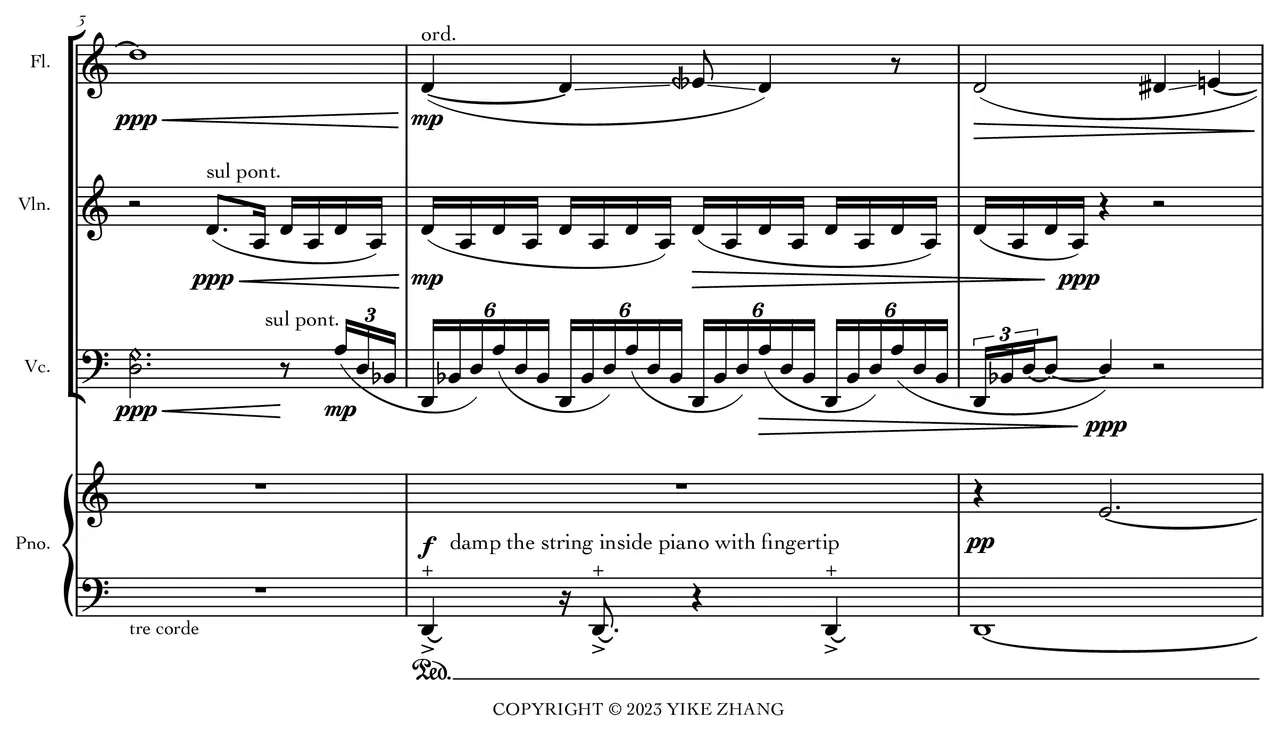 Three Flows in Quartet was commissioned by Rebecca Moranis and Joseph Vaz for their concert Living New York, at the City University of New York Graduate Center on October 27th, 2023. I composed the piece in the late summer, when I spent most of my time in the sunshine in Brooklyn. I tried to capture the pure relaxed feeling. The piece has three movements, like three diary entries. Each of them has a very static texture and slow development.