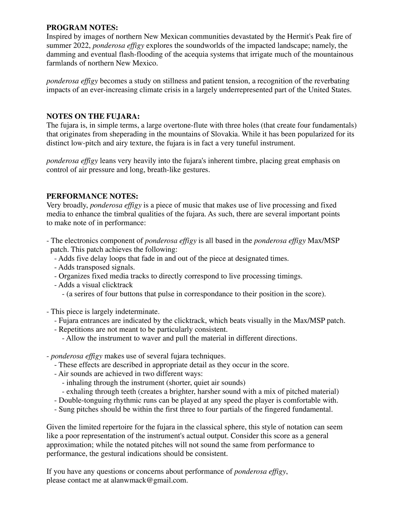 Inspired by a scene from Cormac McCarthy's novel Blood Meridian, the remains of a wildfire in Northern New Mexico, and the devastating acequia flash floods in the mountain communities during the summer of 2022, Ponderosa Effigy explores the ever-increasing brutality ofNew Mexico's wildfire season; expressing the fear and horror conjured by images and stories of affected parts of the state, and fury and anger at the growth of the fossil-fuel industry amidst a hellish climate crisis in such a vulnerable and sacred place.
