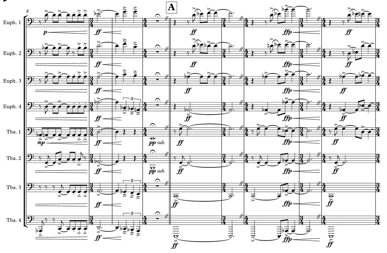 LIMINAL SPACES was written in early 2022 for Thomas Stein and the UMKC Tuba/Euphonium Ensemble. Liminal spaces are often described as unsettling, yet nostalgic locations frozen in time that are transitions between two other places, realms, or states of being. This work consists of five distinct movements, each inspired by five specific pictures (included in the score) that conjure up the feeling of liminality.