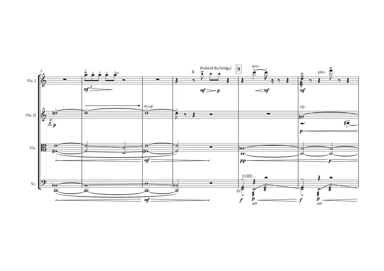 - In like knotted strings, I looked to the work of Jorge Luis Borges, whose literature often tackles themes relating to infinity, labyrinths, and intertextuality. Having established a basic ‘library’ of sound gestures and microtonal chords, I wrote a piece in which I flesh out these materials and explore a handful of their possibilities, with quasi-quotations which provide a glimpse of a musical composition which may or may not exist in a different timeline. In keeping with the Borgesian themes that inspired the work, the piece presents multiple versions of certain passages. Each version leads to a different outcome, which may or may not lead (back) to another version of that same idea. Gestures and harmonies are re-contextualised and presented as half-remembered recollections. As far as a reading of the form of the work is concerned, one may approach the work from different angles, all of which are equally legitimate. In the grand scheme of the structure, each of the four members (or narratives) of the quartet follows their own paths as the music progresses. Sometimes these parts converge in a rhythmically, harmonically, or gesturally homogenous fashion, only to diverge later on. This aspect of the work presented the greatest challenge for me, as I sought to establish the meta-narrative of the music whilst ensuring the work stands as a cohesive whole.