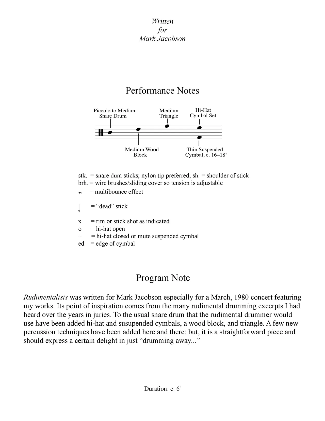 Rudimentalisis was written for Mark Jacobson especially for a March, 1980 concert featuring my works. Its point of inspiration comes from the many rudimental drumming excerpts I had heard over the years in juries. To the usual snare drum that the rudimental drummer would use have been added hi-hat and susupended cymbals, a wood block, and triangle. A few new percussion techniques have been added here and there; but, it is a straightforward piece and should express a certain delight in just “drumming away...”