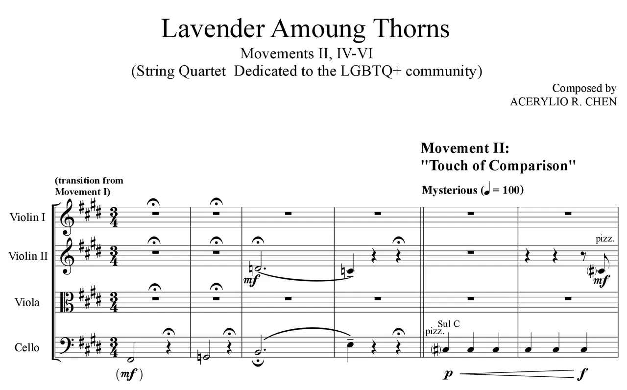 Through what I hope to be the lushly exuberant sounds of my first string quartet, I wish to share just a little of my personal struggles to come to where I am today; and wish to be an uplifting inspiration to those suffering LGBTQ+ individuals of whom this may concern.