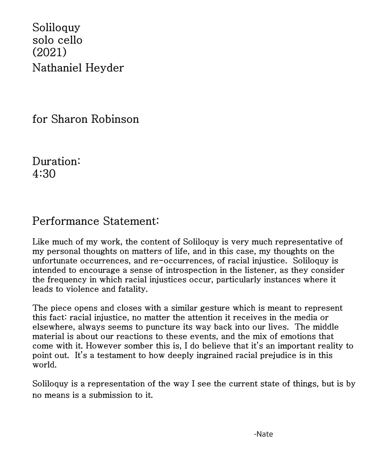 Like much of my work, the content of Soliloquy is very much representative of my personal thoughts on matters of life, and in this case, my thoughts on the unfortunate occurrences, and re-occurrences, of racial injustice. Soliloquy is intended to encourage a sense of introspection in the listener, as they consider the frequency in which racial injustices occur, particularly instances where it leads to violence and fatality.