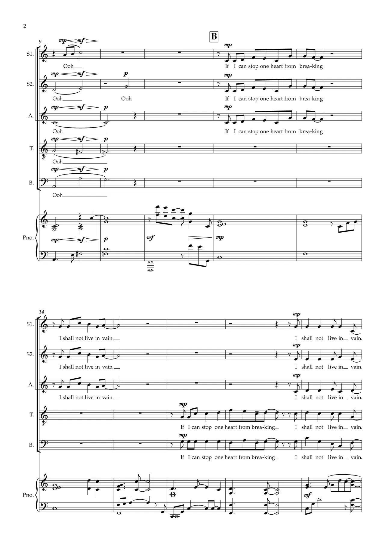 I Shall Not Live In Vain sets uplifting poetry by Emily Dickinson to create a light and peaceful work with a rich, warm texture. This piece was composed for the Gondwana Singers at their 2014 National Choral School. Composed for Gondwana Singers and premiered at the Gondwana National Choral School Concert, 2014.