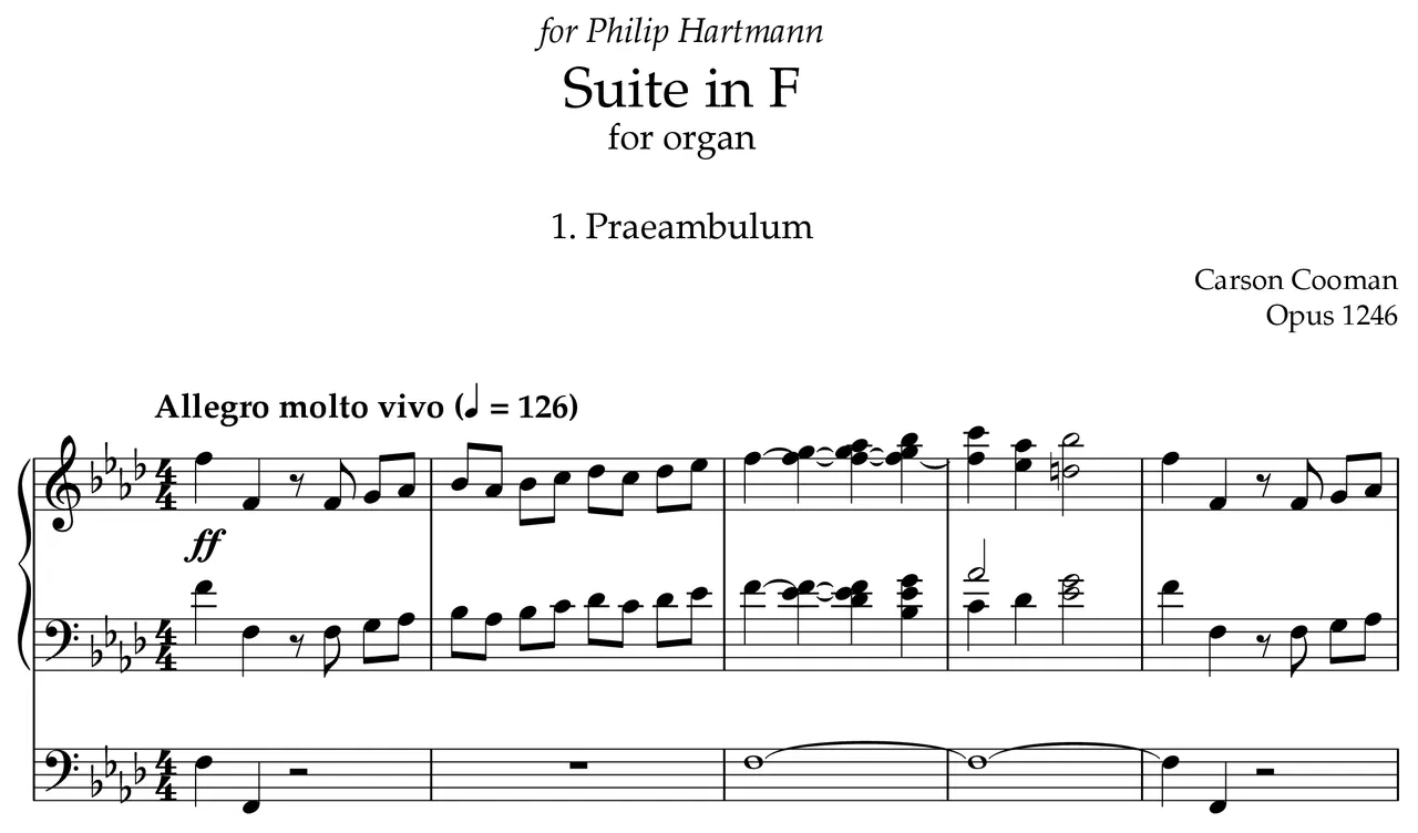 “Suite in F” (2017) is dedicated to organist Philip Hartmann (Ulm, Germany).