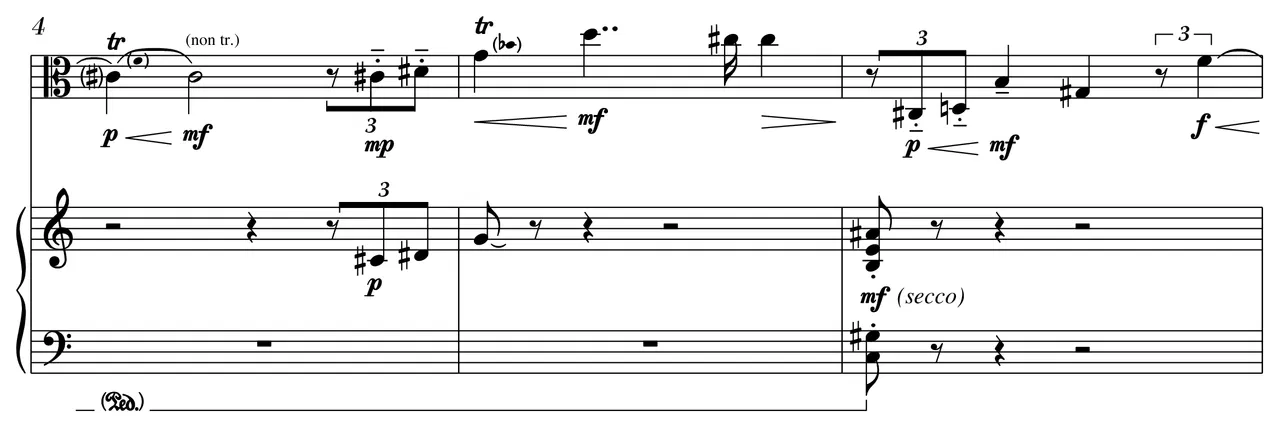 “Cavatina” (2008) for viola and piano is dedicated to Sarah Darling and Jeffrey Grossman. The score is also inscribed in memory of American composer Donald Erb (1927–2008).