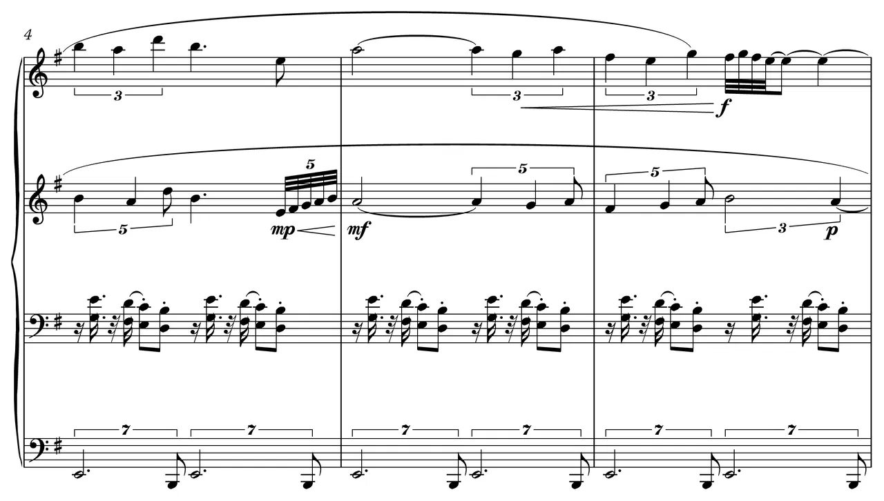 This work is a simple dance in E minor. The two melodic voices engage in heterophonic counterpoint over an ostinato in the bass. A series of bell-like chords briefly asserts itself, before the dance resumes.