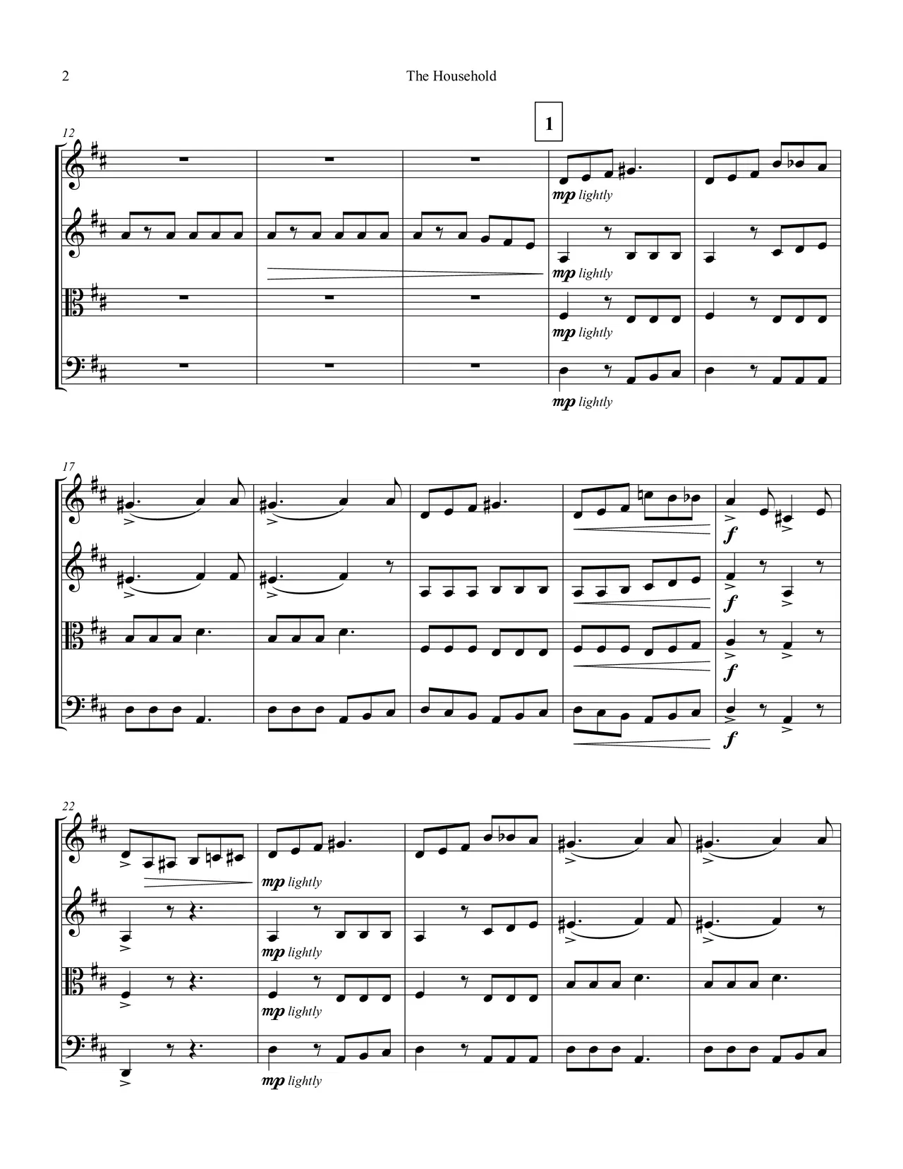 Movement 3, The Household, focuses on one day inside the life of a family. The movement, in rondo form, opens with an introduction eluding to the chaos that is about to ensue. The main theme sneaks in like a child secretly grabbing candy, and quickly grows to a loud burst of joy, but oh no! Someone is onto them.