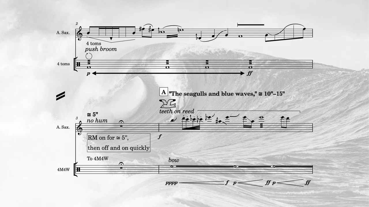 In the performers' score, I quote lines from the poem at the beginning of each musical section to suggest the desired characteristics of the music.* Several extended techniques for the alto saxophone and percussion imitate sounds from the ocean, such as winds, storms, moving sand, the seagulls' chirping, and whales' vocalization. For the electronic percussion, I use the recordings from A Collection of Sounds from the Sea on the website of NOAA (National Oceanic and Atmospheric Administration)** as the sound samples.