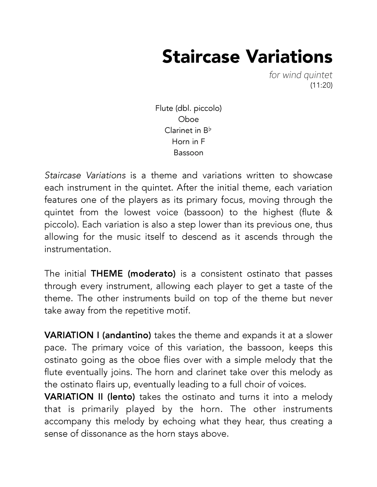 Staircase Variations is a theme and variations written to showcase each instrument in the quintet. After the initial theme, each variation features one of the players as its primary focus, moving through the quintet from the lowest voice (bassoon) to the highest (flute & piccolo). Each variation is also a step lower than its previous one, thus allowing for the music itself to descend as it ascends through the instrumentation.