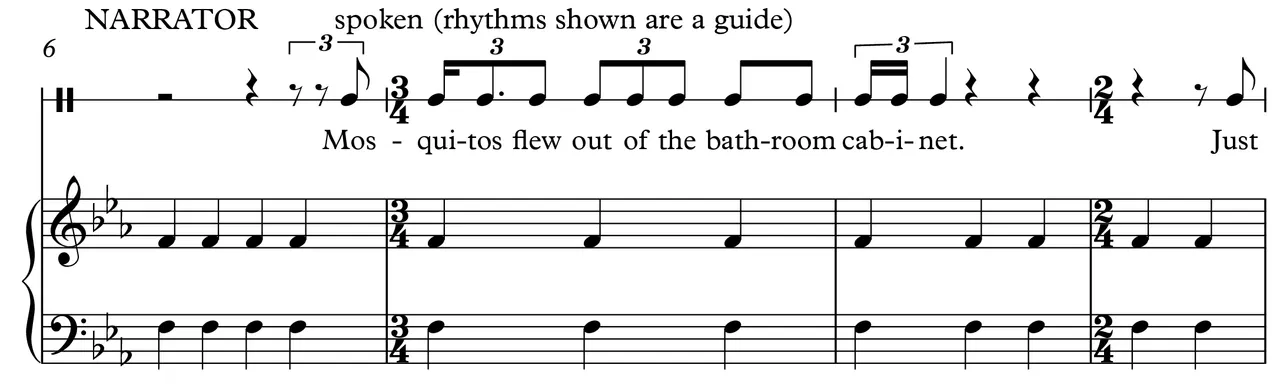 Spoken with a natural speech inflection, with notated rhythms providing a guide;