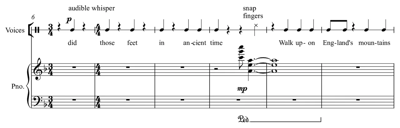 In this setting of William Blake's words (from the preface to his book 'Milton' ca. 1804-08) the composer imagines the performers in a time before Britain was an Empire - in a landscape, which although it may be green, is also mountainous, overcast and cold enough for the air to