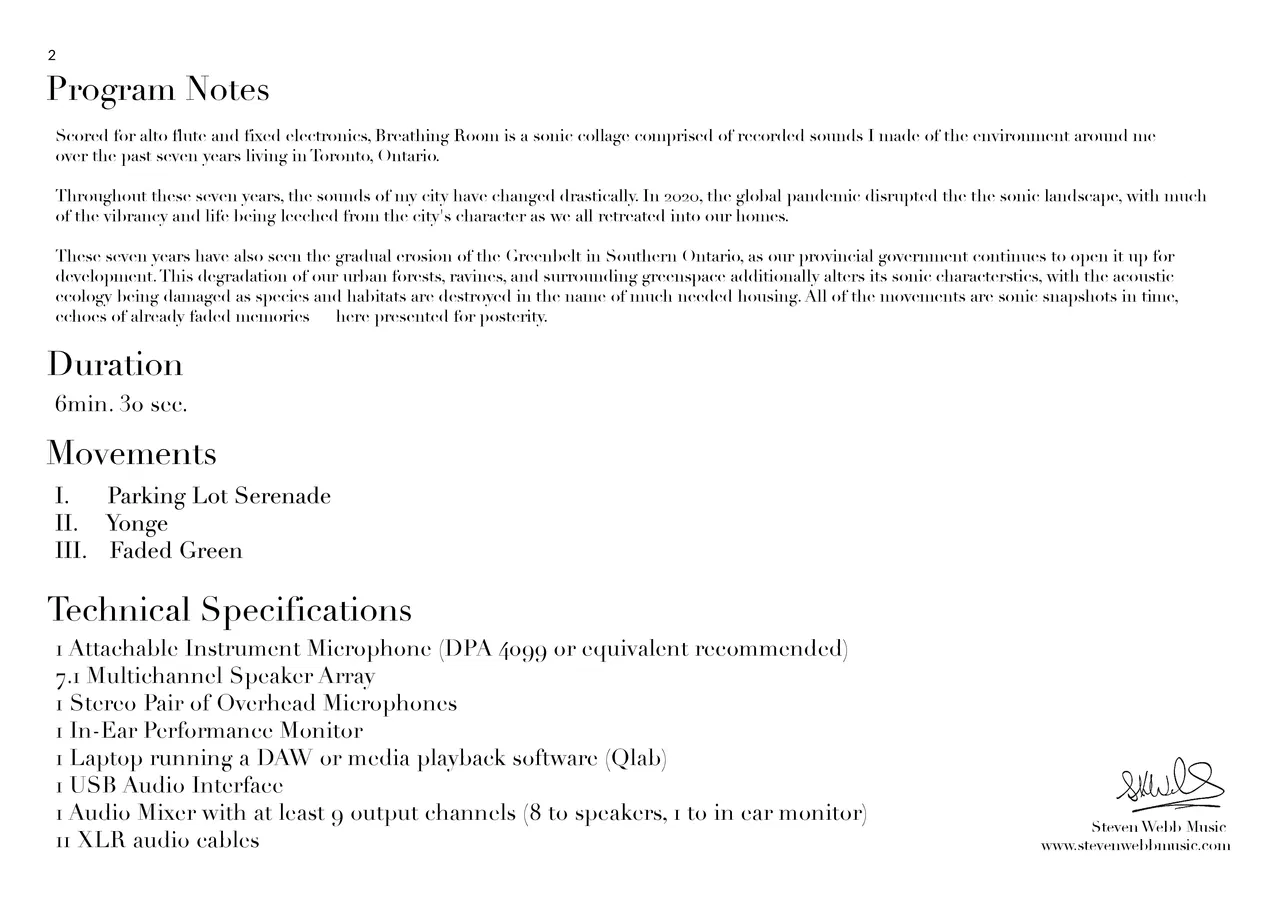 Scored for alto flute and fixed electronics, Breathing Room is a sonic collage comprised of recorded sounds I made of the environment around me over the past seven years living in Toronto, Ontario.
