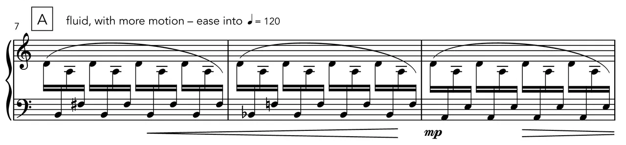 "Sunrise, on canvas" is an early-intermediate 4-mallet solo, inspired by J. M. W. Turner's Sunrise, with a Boat between Headlands (c. 1840-5). It draws from Turner's watercolors in waves of (sometimes murky) harmony, and has flashes of the reflection of the sun – in some ways a nod to Mitchell Peters' iconic "Yellow After the Rain”.