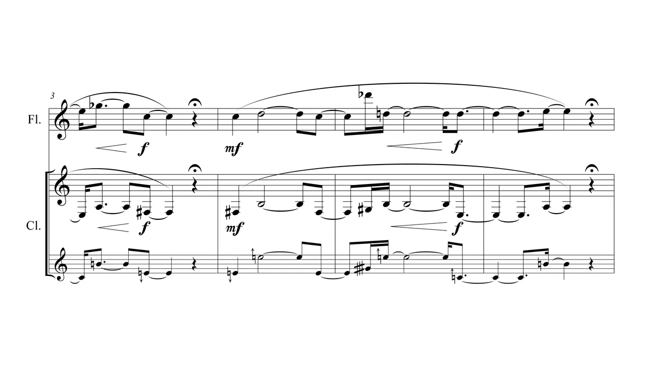 Hohler Fels ("hollow rock") was inspired by a 35,000-year-old fragment of a bone flute discovered in Germany and on display at the University of Tübingen. The work explores exotic intervals possible between a contemporary flute and half of a B-flat clarinet.