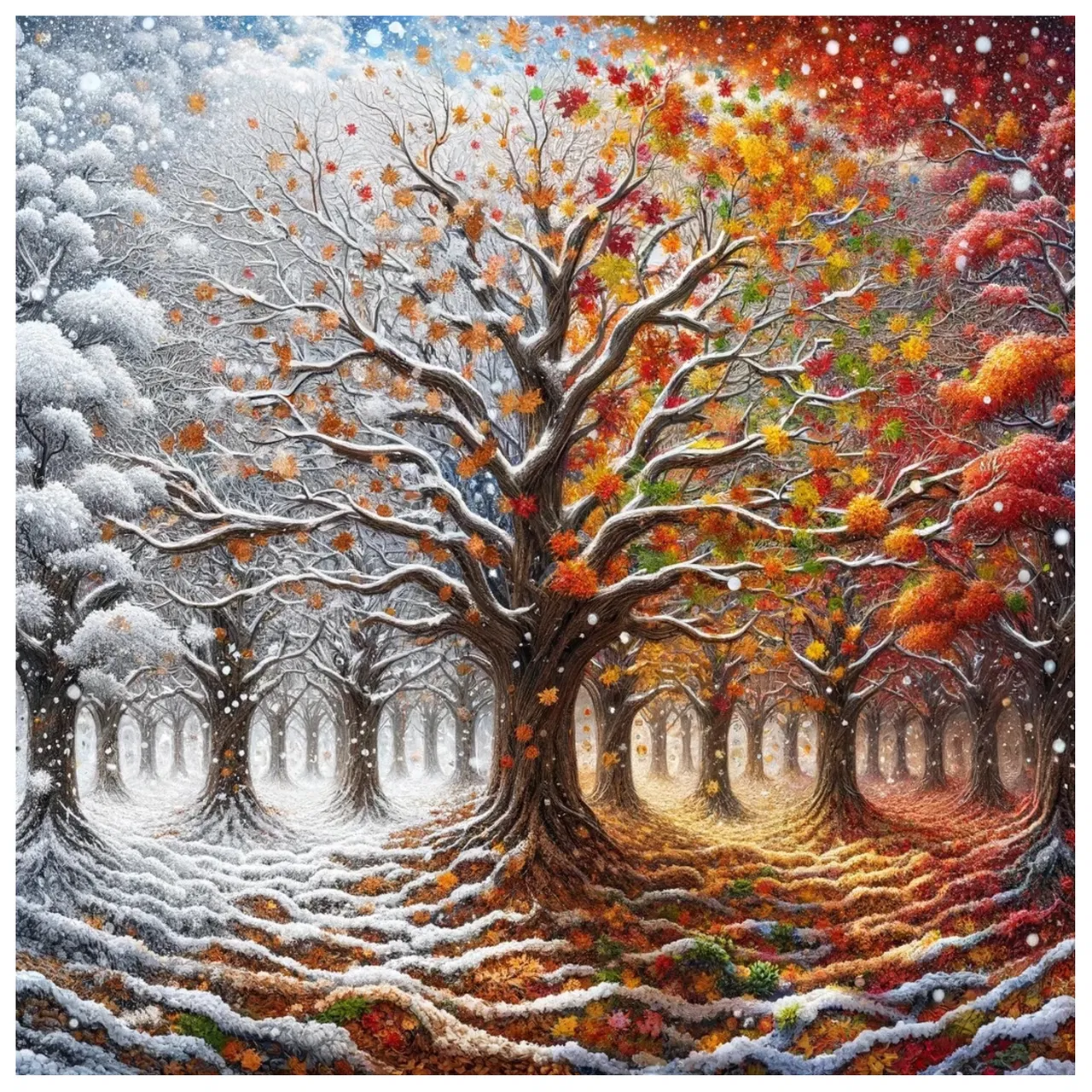 Leaves Fall Like Snow is a seven-minute piece for a piano trio that portrays the last leaves falling onto the ground along with snow on the final day of winter. The piece predominantly stays in the extremely high register to depict the floating journey of the leaves and snow until they touch the ground. Its floating movement is enhanced by the extensive use of grace notes and calligraphic glissandi. At several moments when the leaves touch the ground, they release the memories of the entire year they have cherished, which never last long enough. The climactic point washes away the last bits of reminiscence with a sudden gust of rich harmony and pleasing dissonance. At the request of the trio to respond to Piazzolla’s Four Seasons on the program, the last minute of the piece incorporates a melodic quotation from Piazolla's Winter to signify the complete arrival of winter. As the snow melts, heralding the arrival of spring, the piece concludes with the melody of Spring from the same work by Piazzolla.