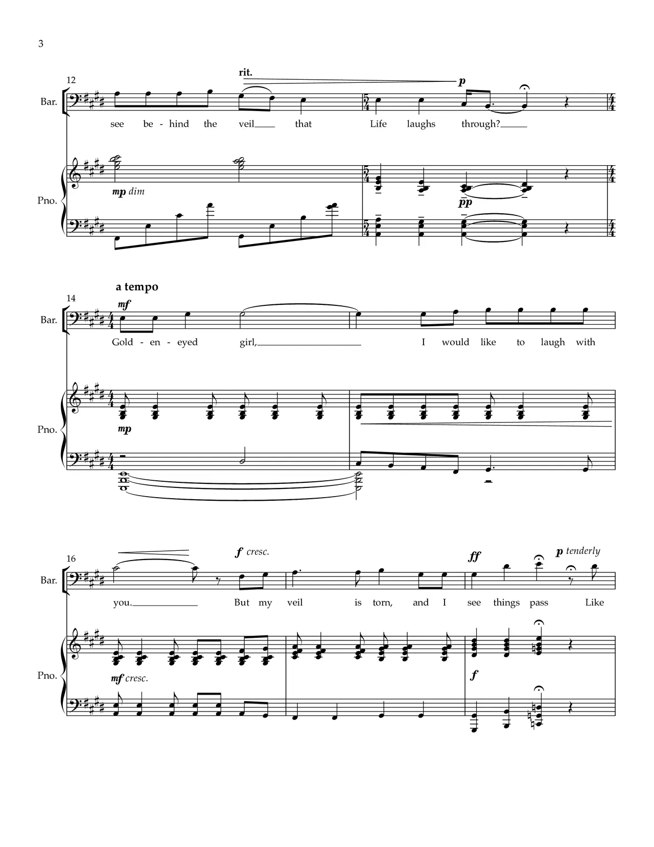 When my friend Kyle Forehand asked me to compose a song for him to sing for the inaugural Indiana SongSLAM! competition in December of 2023, I was incredibly excited. Kyle had taken German with me that semester and we had discussed collaborating. Having had just turned 20 years old, I was experiencing the anxiety and absurdity of growing up. It seemed not long ago that my brothers and I lived in the same house, that I would come home from school and immediately start riding my bike with the kid that lived next door. I wanted to find a poem that reflected on growing up in a beautiful way. I thought Gidlow's poem does that. The speaker tells the young girl that life becomes more difficult in some ways and that she should enjoy life while she can. I hypothesize that this poem is written to either a younger family member or to a younger version of herself, perhaps encouraging them to always appreciate life's beauty, while also grieving her youth.