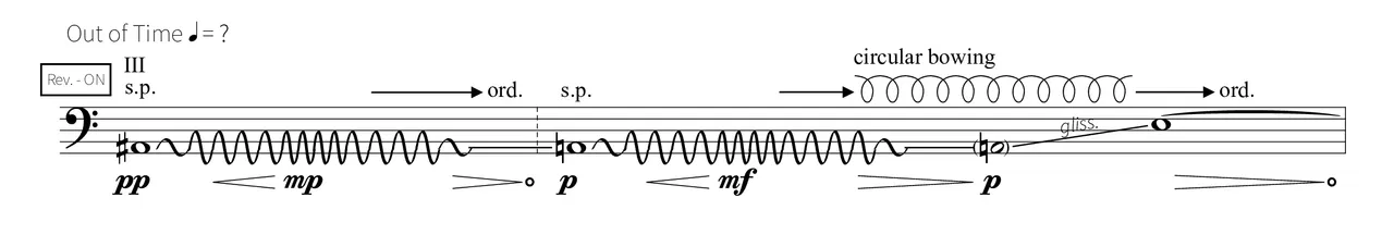 The Distorted Mirror is my musical interpretation of the life and ideas of the philosopher Diogenes. When evaluating Diogenes’ ideas of shedding away all “unnecessary” eccentricities, I decided that the piece needed to be constructed using twelve-tone technique. In addition to some standard “0 position” rows on the matrix (P0, R0, I0), I also introduced the concept of a mirror version of each of these rows over axis of the five-line staff. In addition to the harmonic mirror, most of the extended techniques in the piece are meant to acoustically distort the tone rows to create a less pure harmonic and melodic foundation while introducing darker and more aggressive sounds.