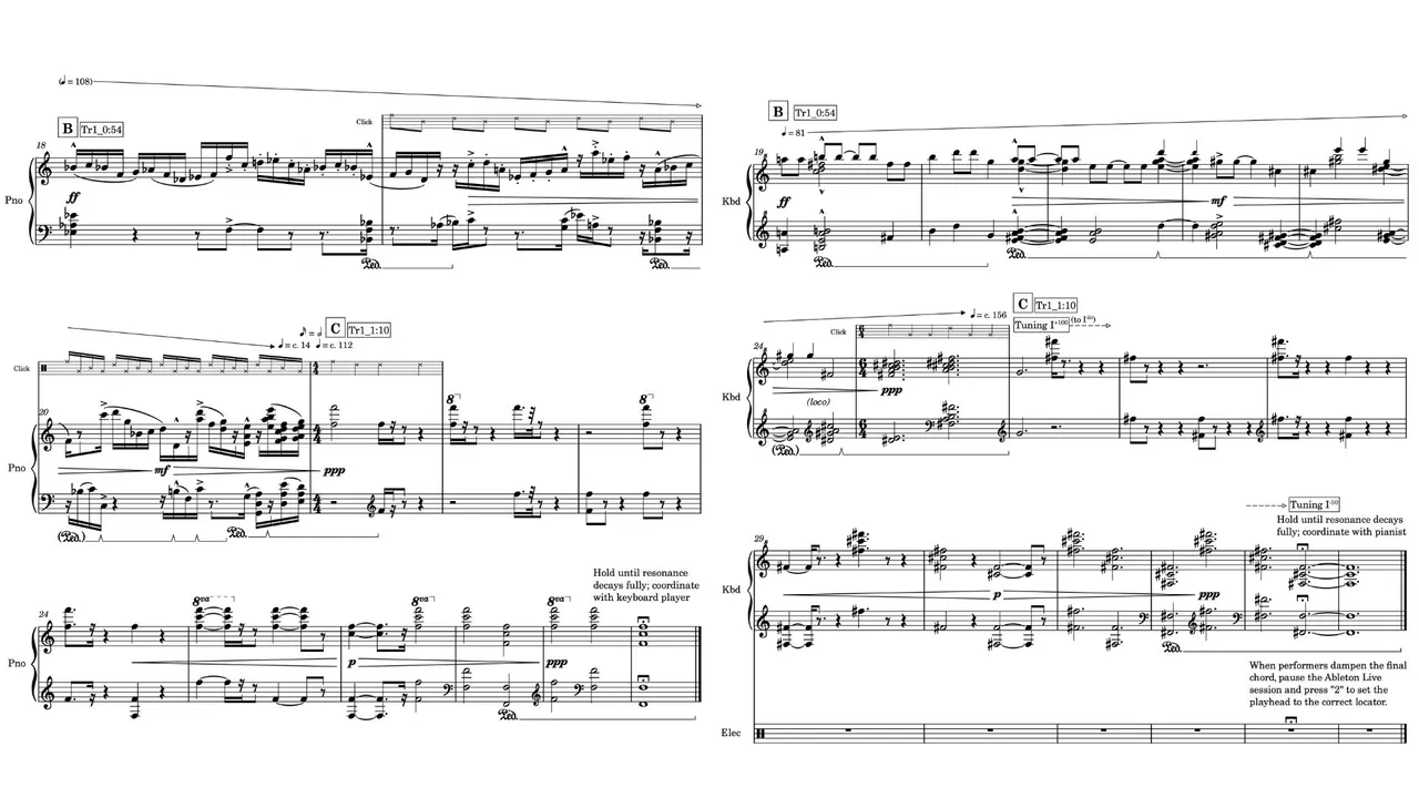 I cannot help but reflect on the immeasurable gap that technology has created between the time in which these chants were first set down and the vantage point from which I now view them. Technology has allowed me to access these chants, compose this music, produce the electronics, and coordinate the poly-tempi and real-time tuning changes in the performance. It is the agent which pushed us past the Quiet Revolution and propels us inexorably into the future, leaving in its wake an endless stream of forgotten cultures, silently absorbed into our nascent globalism.