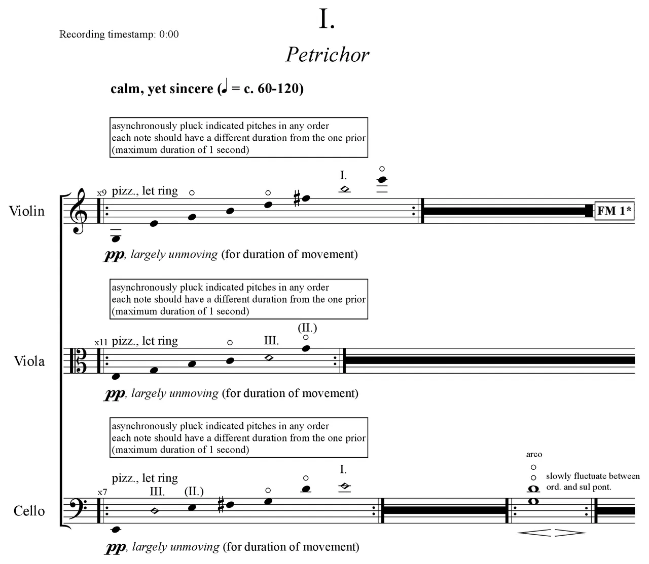 This work was premiered at The TANK Center for the Sonic Arts on September 22, 2024 by Jordan Grantonic (violin), Emma Reynolds (viola), and Peyton Magalhaes (cello). The TANK is well known for its uniquely intense acoustic resonance, in which sounds can last up to 50 seconds before fading away. More information about the TANK can be found here: tanksounds.org/
