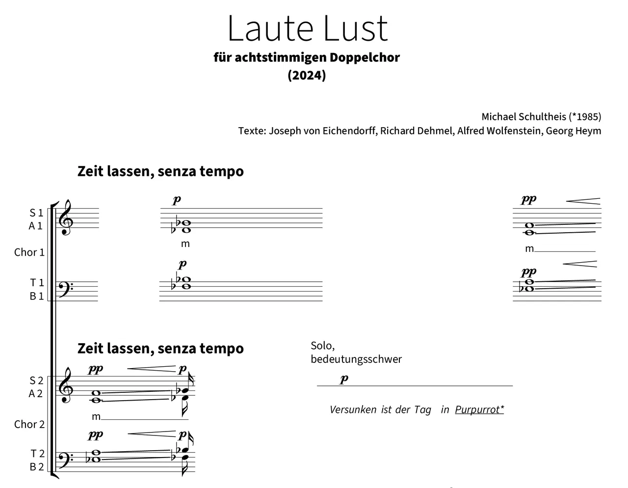 The composition is based on the poem “Der Abend” (1817) by Joseph von Eichendorff. In his romantic imagination, man can only find himself in the silence of the forest in the evening and let his heart be moved. Individual lines of poetry by Richard Dehmel, Alfred Wolfenstein and Georg Heym intersperse the Eichendorff verses with commentary. The poems of the Expressionists, written a good hundred years later, seem like a late response to the fears of the Romantics, who, as early as the 19th century, saw an escape into nature as a way out of the changing and industrializing world. Here, too, ideas of the evening are thematized, the contrast between city and country, the experiences of war. The texts meet in dialog across the abyss of time and combine to form a tentatively hopeful message to the present.