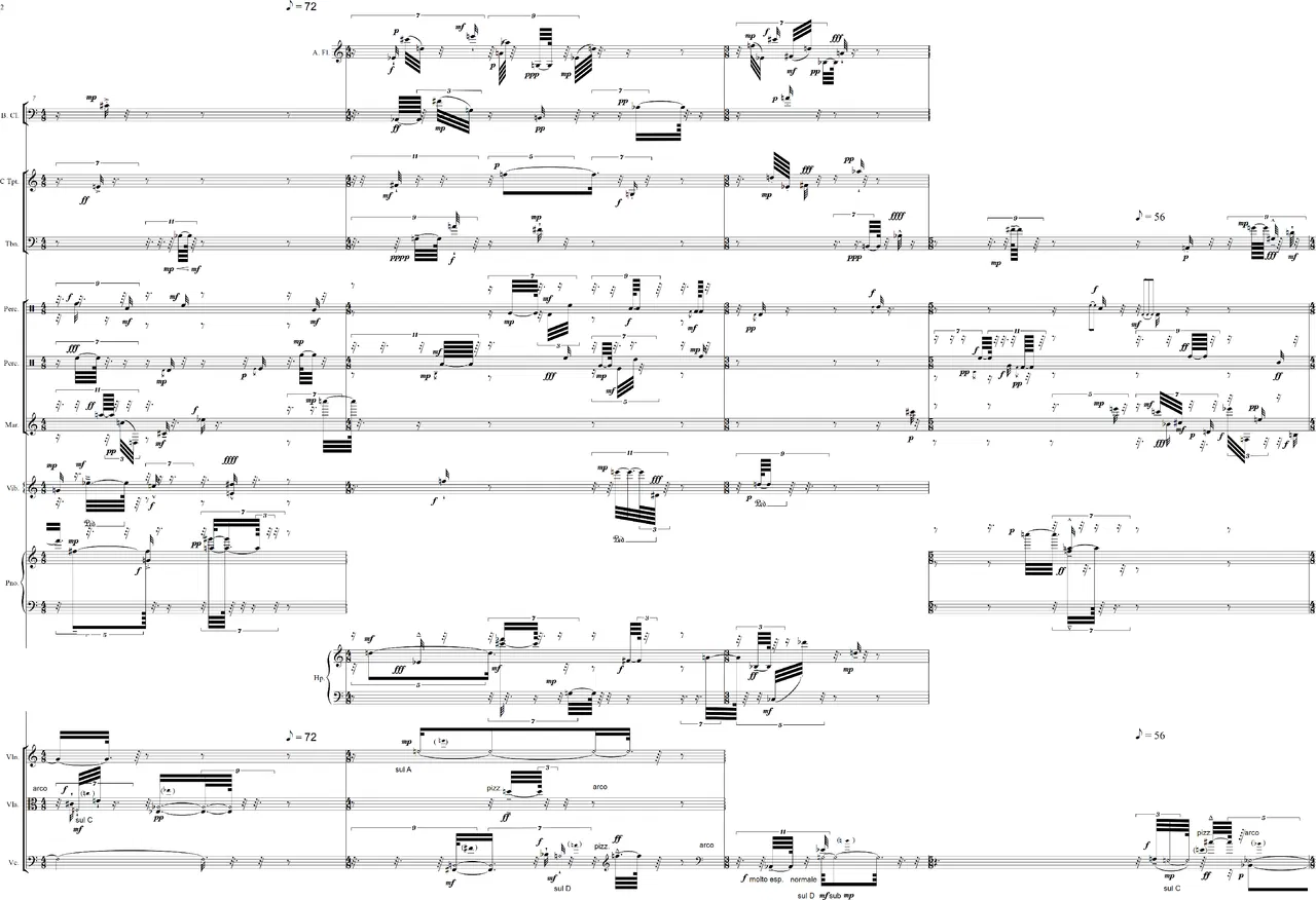 Instrumentation: Alto flute, Bass clarinet, Trumpet in C, Trombone, Harp, Piano, Marimba, Vibraphone, Violin, Viola, Cello Percussion 1: Guiro, claves, 5 temple-blocks (high to low), 2 bongos (high, low). Sticks: hard Percussion 2: chocolo, maraca, 5 cowbells (high to low), 3 woodblocks (high to low), 2 timbales (high, low), 3 tom-toms (high to low). Sticks: hard