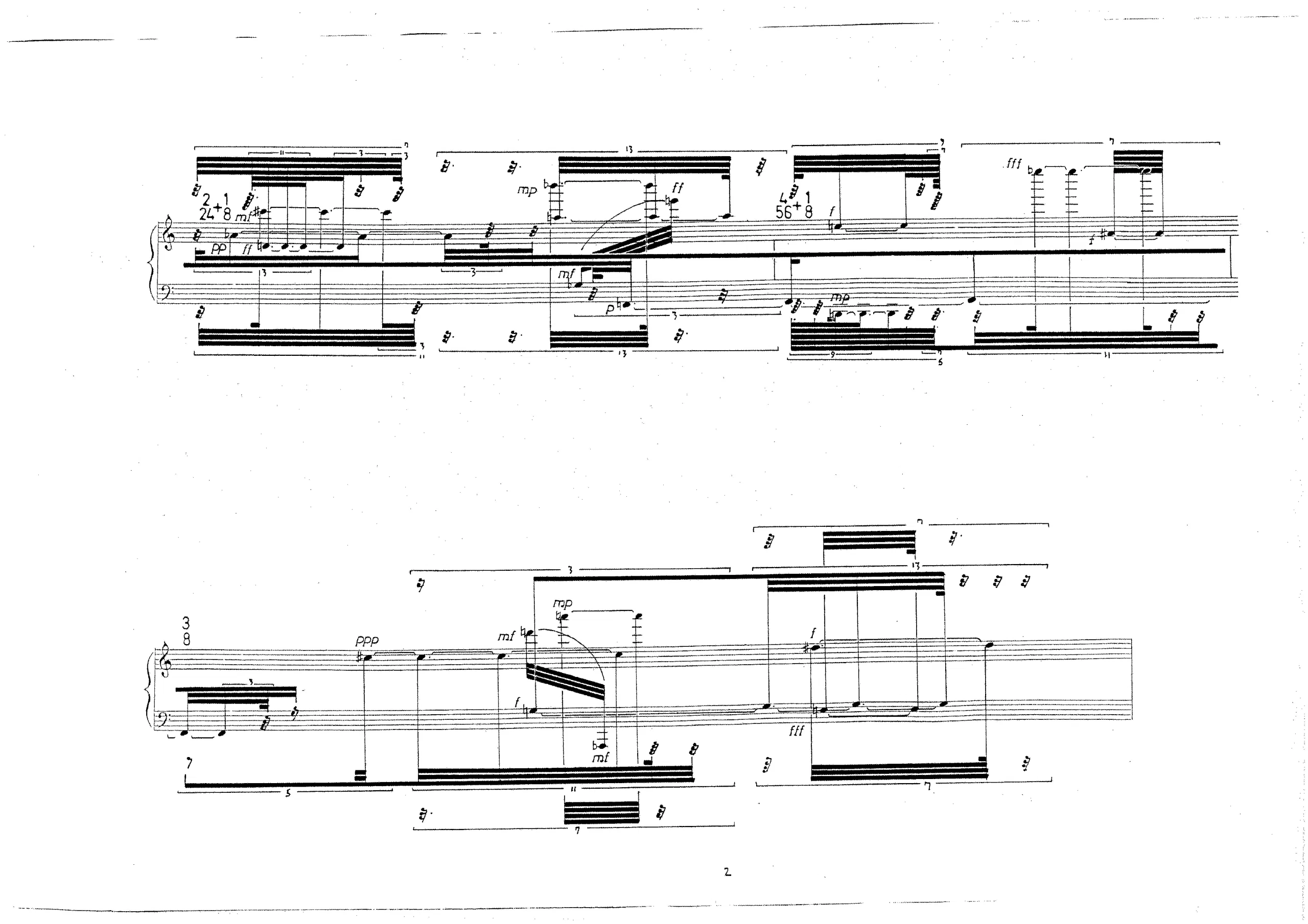 The notational and temporal data-structural representations utilised in piano piece 2 have essentially two functions. The first, technical-aesthetic, seeks to extend and build upon those technical researches initiated most prominently in integral serialism and associated practices: in particular, the extension and application of temporal fractionization to meter. The second, aesthetic-critical, seeks to embed within the notational fabric a resistance to reification. The consequent problematisation of the medium that is a product of these two processes represents the space of interaction where the two functions merge.