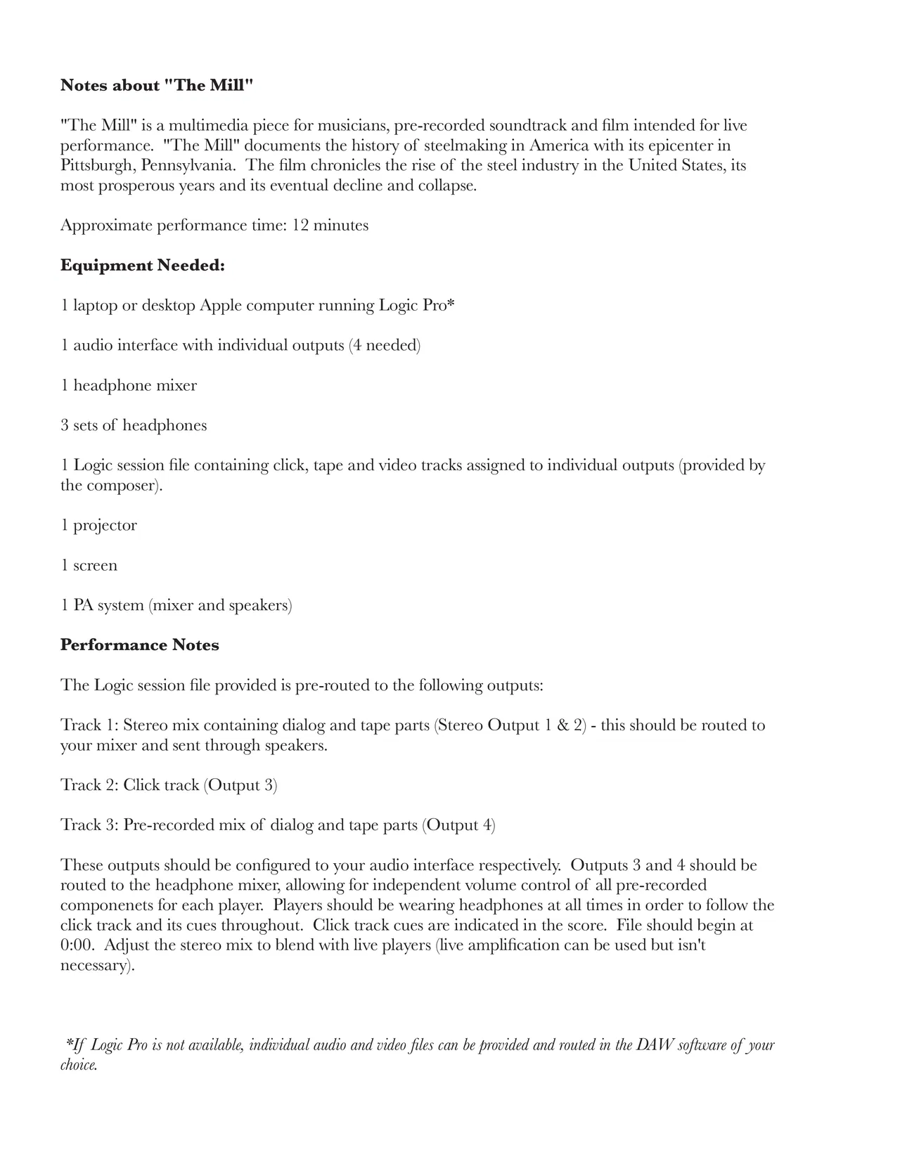 "The Mill" is a multimedia piece for live musicians, pre-recorded soundtrack and film intended for live performance. "The Mill" follows the history of American steelmaking from its epicenter in Pittsburgh, Pennsylvania. It chronicles the rise of the steel industry in the United States, its most prosperous years and its eventual decline and collapse.
