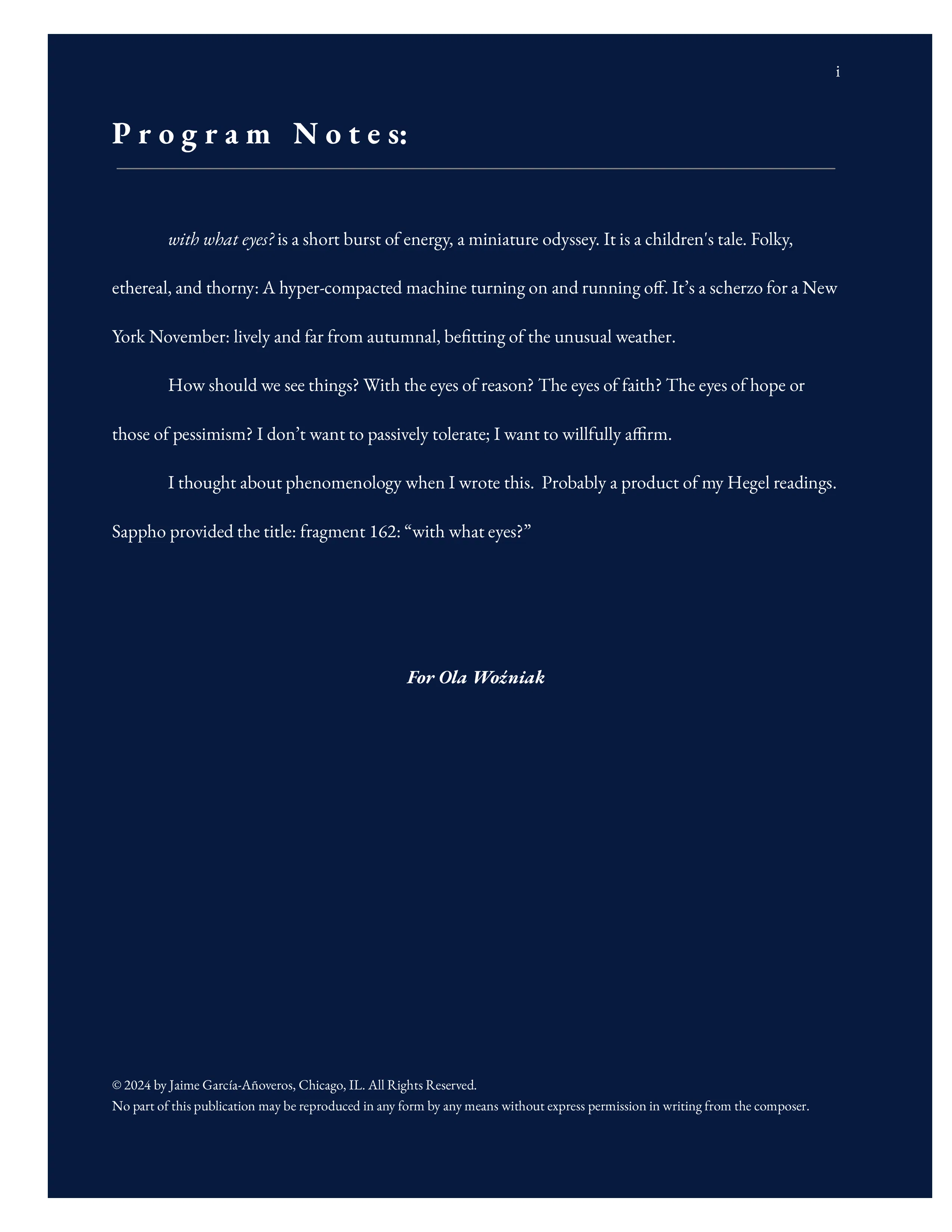 Program Notes: with what eyes? is a short burst of energy, a miniature odyssey. It is a children's tale. Folky, ethereal, and thorny: A hyper-compacted machine turning on and running off. It’s a scherzo for a New York November: lively and far from autumnal, befitting of the unusual weather.