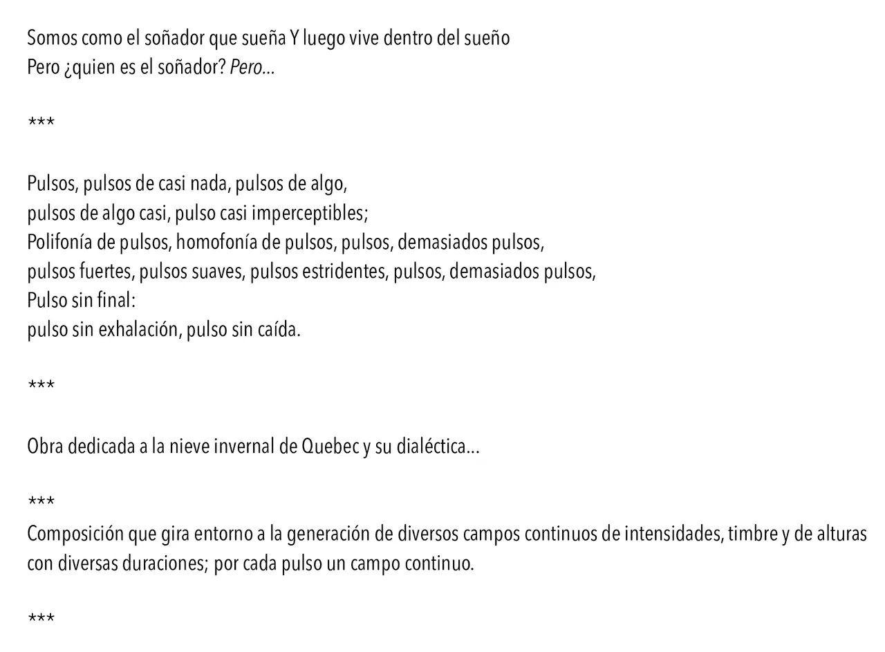 Composición que gira entorno a la generación de diversos campos continuos de intensidades, timbre y de alturas con diversas duraciones; por cada pulso un campo continuo.
